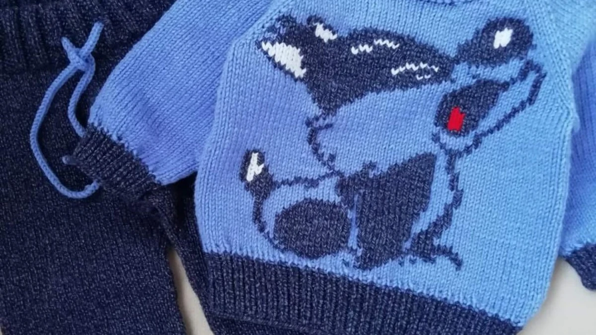 Этот очаровательный вязаный комплект для малыша, состоящий из свитера с изображением мультяшного персонажа и штанишек, несомненно привлечёт внимание. Использованное изображение придаёт вещи забавный и оригинальный вид, а цветовое сочетание мягких голубых и более тёмных оттенков добавляет гармонии. Свитер и штанишки выполнены аккуратно, с высоким качеством вязки и хорошей отделкой.
