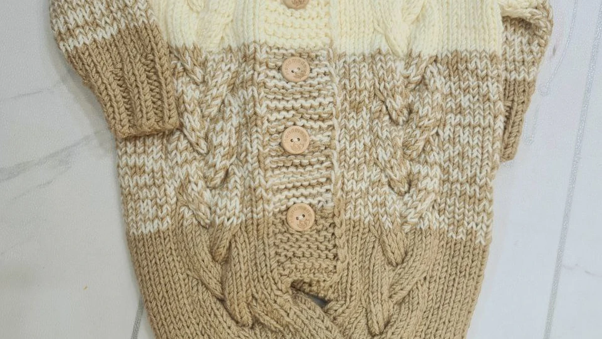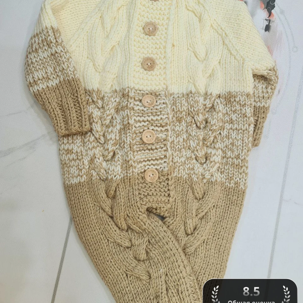 Этот уютный вязаный спальник для малышей представляет собой мягкое сочетание кремового и карамельного цветов, украшенное красивыми деревянными пуговицами. Спальник выполнен в технике вязания кос, что придаёт ему текстурированную глубину и привлекательность. Он явно создан с большим вниманием к деталям и любви к вязанию, что делает его не только удобным, но и эстетически приятным изделием для вашего малыша.