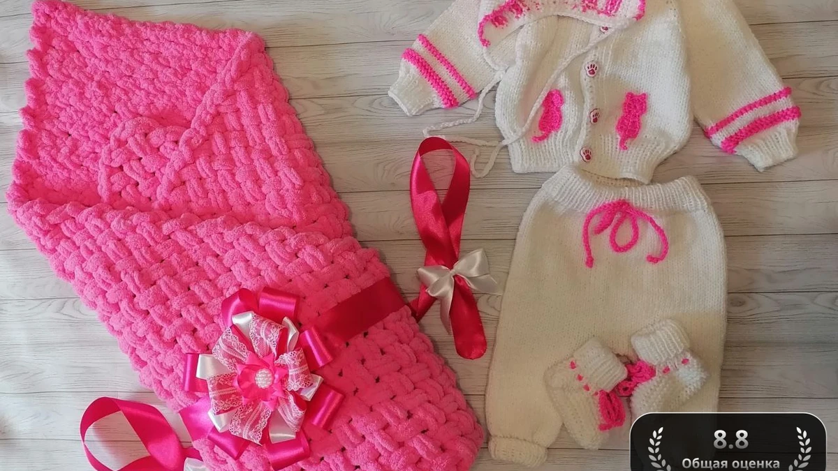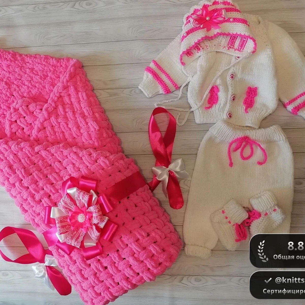 Очаровательный комплект для новорождённой принцессы: уютный плюшевый конверт-кокон ярко-малинового цвета, украшенный пышным бантом, и классический белый гардероб с неоново-розовыми акцентами. Кардиган с котиками-силуэтами на полочках, штанишки с кулиской-айкордом, мягкая шапочка с полосами и объёмным цветком, а также миниатюрные пинетки на завязках образуют гармоничный ансамбль. Контраст фактур — крупная «корзинка» плюшевого полотна и ровная лицевая гладь тонкой пряжи — подчёркивает мастерство рукодельницы и создаёт нежное, радостное настроение.