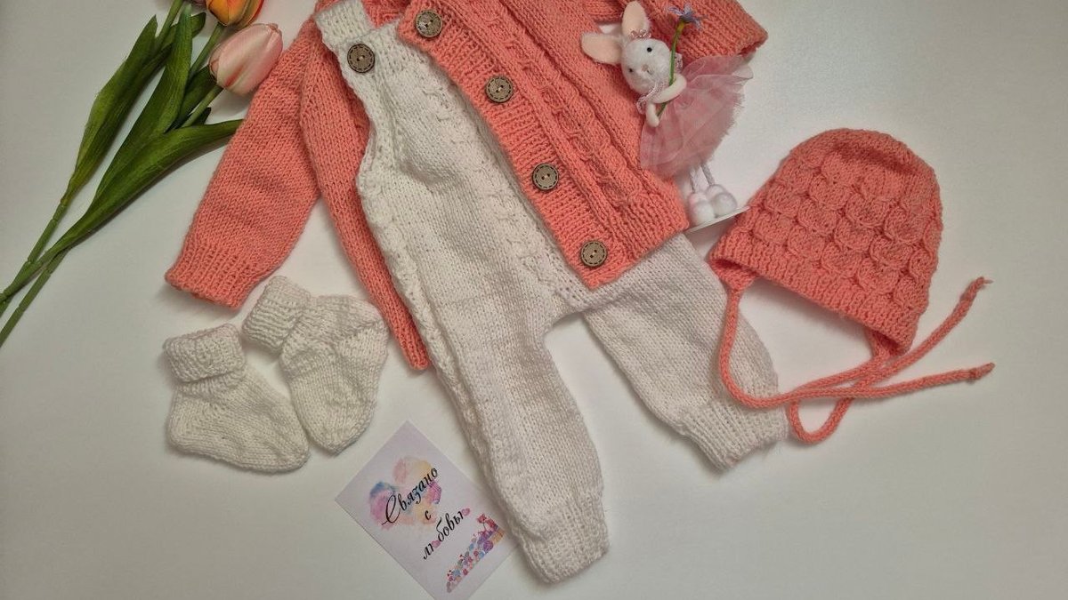 Нежный комплект для малыша в кораллово-сливочной гамме выглядит очень цельно и «магазинно»: кардиган с аккуратными косами и планкой на пуговицах, штанишки с мягкими манжетами, шапочка с рельефным узором и пинетки в тон. Полотно в целом ровное, убавки/прибавки визуально чистые, резинки держат форму. Палитра удачная — тёплый коралл красиво подчёркивает молочный оттенок. Есть ощущение продуманного набора «на выписку/подарок», а декоративные детали делают работу особенно уютной.