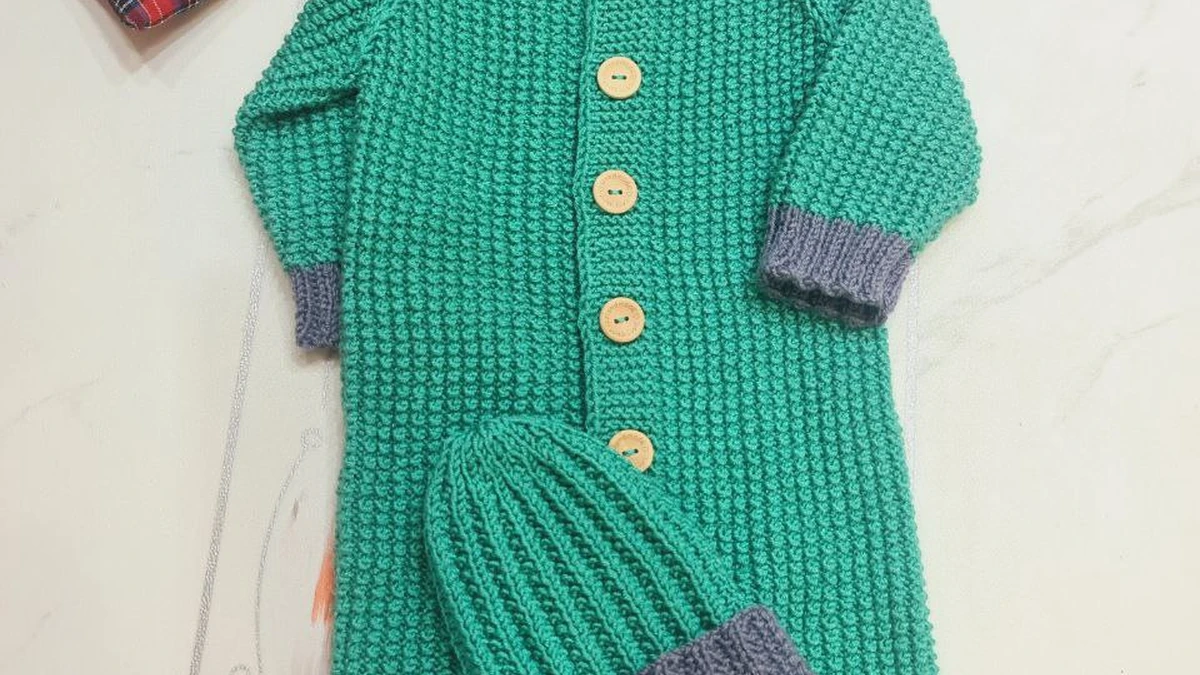На фотографии представлено очаровательное вязаное детское комбинезон с шапочкой. Использована замечательная комбинация ярко-зеленого и темно-серого цветов, что придаёт изделию превосходное цветовое сочетание. Большие, деревянные пуговицы добавляют уют и функциональность. Дизайн идеально подходит для малышей и выглядит одновременно комфортно и модно. Рядом с комплектом расположен мягкий щенок, что усиливает атмосферу тепла и уюта.