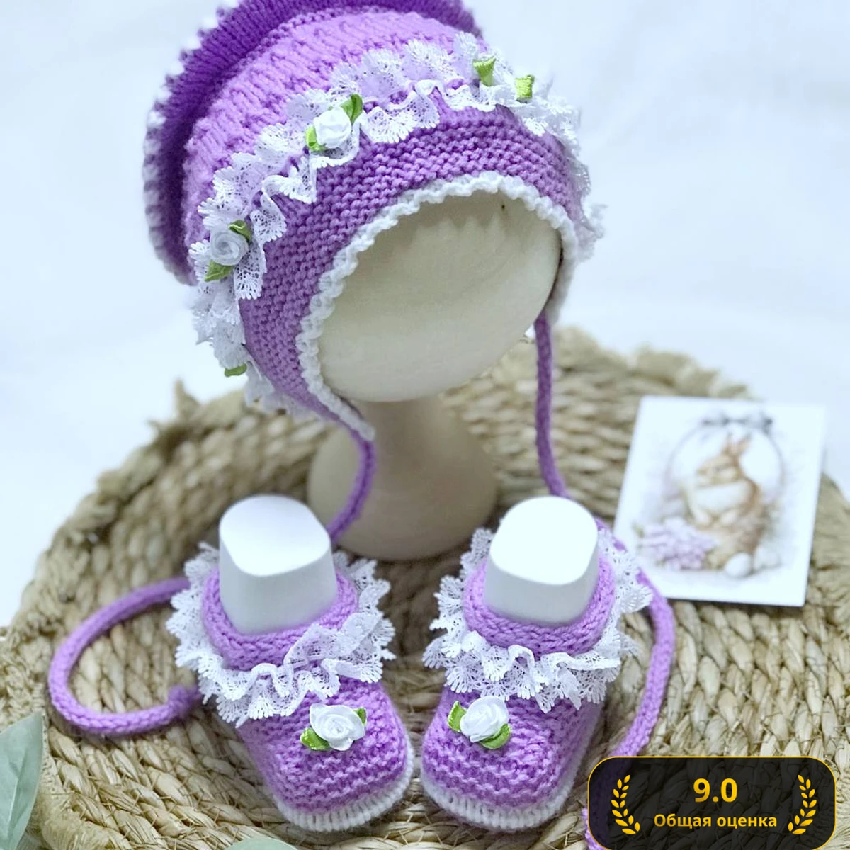 На фото — очаровательный комплект для малышки: чепчик и пинетки в нежной лавандовой гамме. Полотно связано очень ровно, с аккуратной плотностью и чистой кромкой; особенно хорошо смотрится фактурная вязка (похожа на платочную/рисовую), которая держит форму и выглядит «дорого». Отделка — белая ажурная тесьма-оборка и маленькие розочки с зелёными листочками — добавляет образу праздничности, но не перегружает. Завязки у чепчика длинные и мягкие, пинетки с контрастной белой окантовкой смотрятся завершённо. Композиция кадра уютная, хотя свет чуть пересвечивает фон и «съедает» объём.