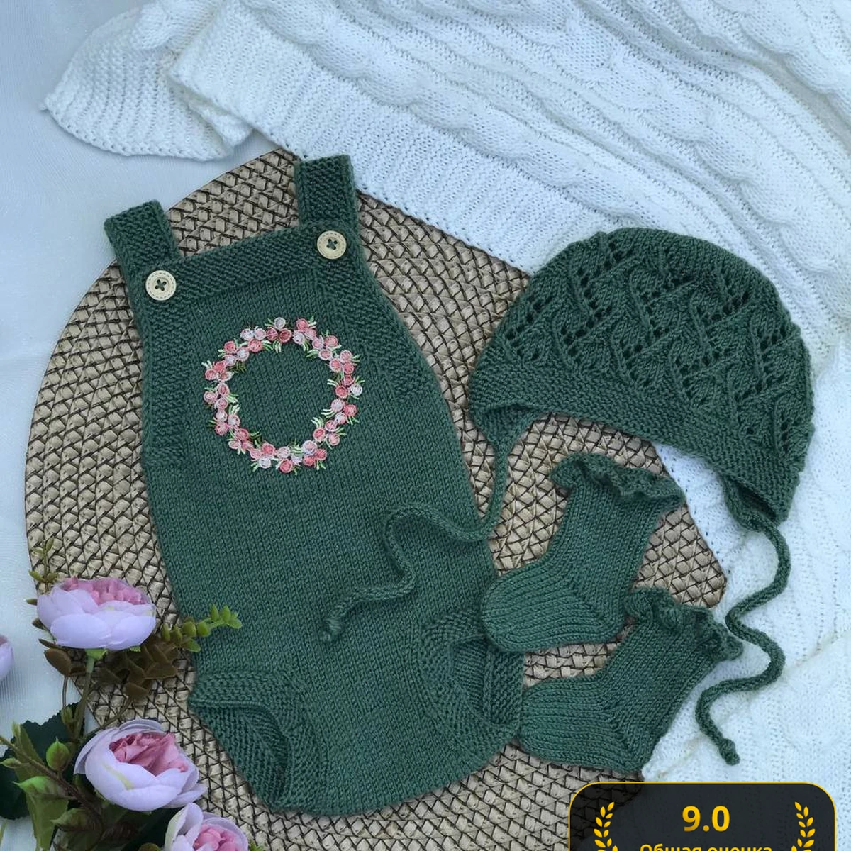 Очаровательный комплект для новорождённого в благородно-зелёном цвете: аккуратный ромпер на пуговицах, декорированный нежнейшим веночком из розовых и белых вышитых цветов, ажурная шапочка-капор с завязками и парой рюшечных носочков. Мягкая пряжа, ровные петли и продуманные детали создают ощущение нежности и уюта. Белый плед с объёмными косами на заднем плане подчёркивает насыщенность зелёного, а композиция дополняется букетом пионов, создающим весеннее настроение. Каждая вещь гармонирует с остальными, образуя целостный, романтичный образ для маленькой принцессы.