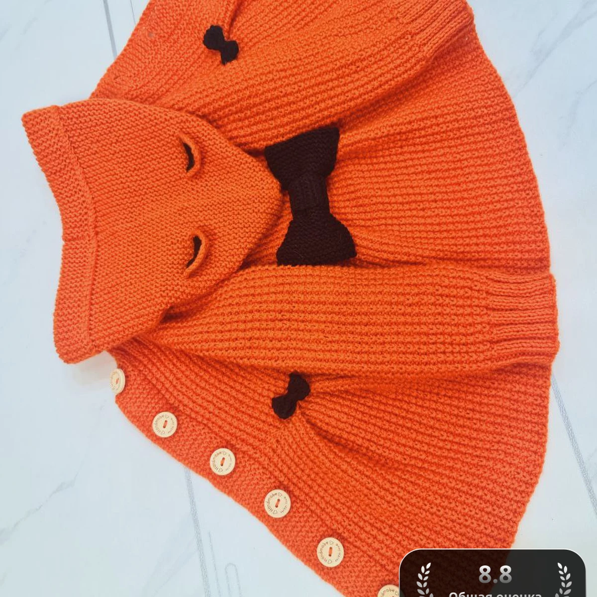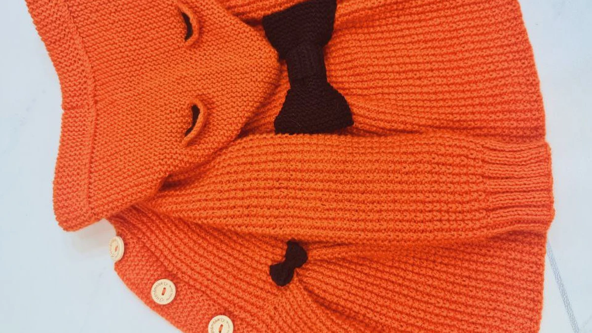 Этот замечательный вязаный комплект привлекает внимание живым оранжевым цветом, который напоминает летнее солнце. В комплекте присутствует уютная шапочка с забавными ушками, которые делают её похожей на лисёнка. Они привносят элемент игривости в изделие. Центральный акцент на шапке - это чёрный бантик, добавляющий милую изюминку. На пледе или пелерине нашиты аккуратные деревянные пуговицы, которые добавляют функциональности и стиля. Весь комплект отлично подходит для маленького ребёнка, создавая тёплый и уютный образ.