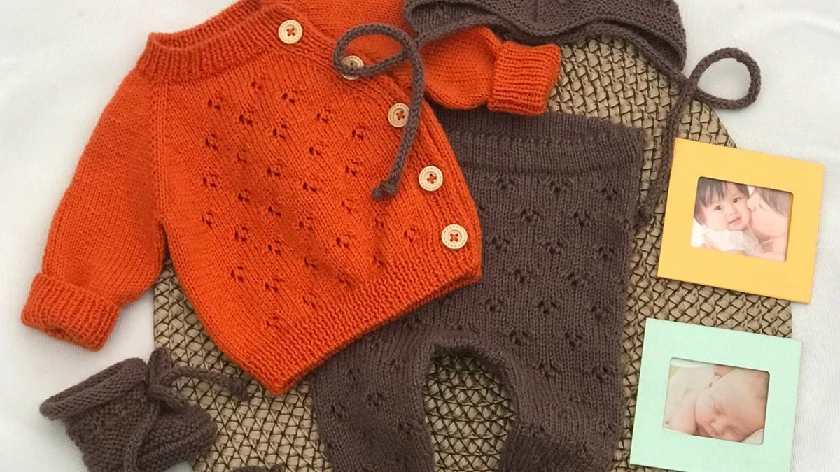 Очаровательный детский комплект из четырёх предметов: яркий тыквенно-оранжевый реглан на пуговицах, шоколадные штанишки с ластовицей, шапочка с ушками и мягкие пинетки-чешки. Все детали объединяет аккуратный ажурный рисунок «дырок» в шахматном порядке, который добавляет лёгкости полотну и визуально связывает разноцветные элементы в единый образ. Плавные регланные линии, ровные убавки на манжетах и идеально пришитые деревянные пуговки подчёркивают высокий уровень исполнения. Контраст тёплого оранжа и землистого коричневого выглядит по-осеннему уютно и стильно, а нежная пряжа средней толщины делает комплект практичным и комфортным для малыша.