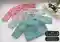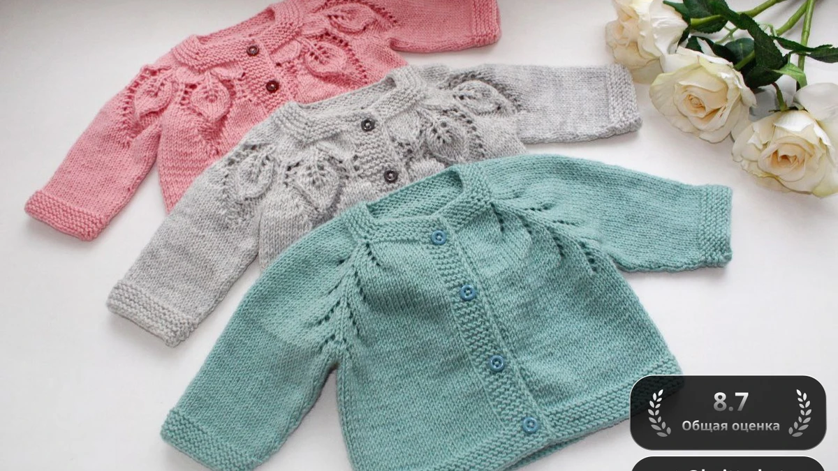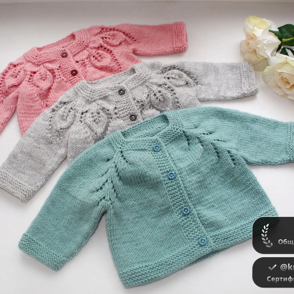 На фото ‑ три очаровательных детских кардигана с цельновязанной кокеткой «листочки»: пудрово-розовый, светло-серый и мятный. Ажурные листики обрамляют горловину, создавая игривый рельеф и подчёркивая круглую форму кокетки. Чёткие ровные лицевые ряды сочетаются с фактурной платочной планкой и манжетами, а маленькие пуговки в тон добавляют завершённости. Гармония нежных пастельных оттенков делает изделия по-настоящему воздушными и подчёркивает аккуратность исполнения. Эти кардиганы выглядят уютно, празднично и одновременно практично, идеально подойдут для фотосессии малыша или в качестве душевного подарка к выписке.