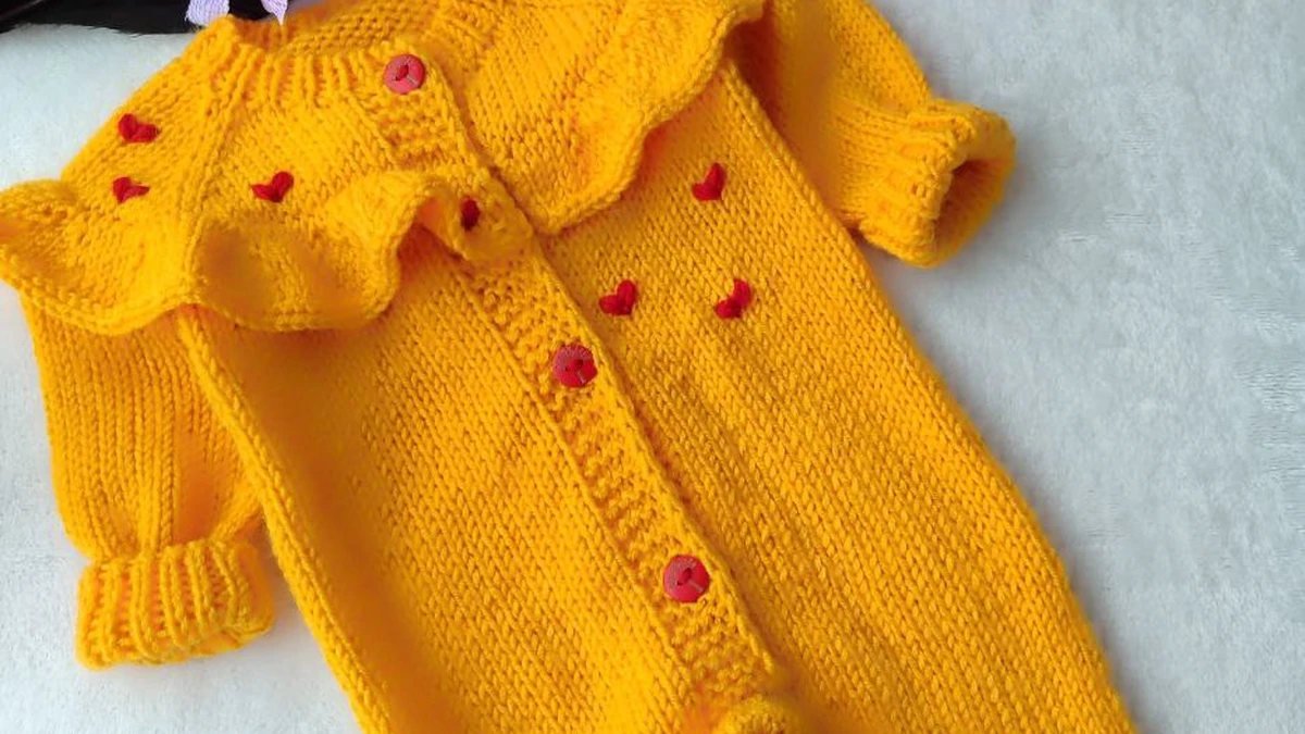 Этот милый детский комбинезон выполнен в ярком жёлтом цвете и украшен красными пуговицами и декоративными маленькими сердечками. Рябрик выполнен с изящной оборкой. В комплекте идут уютные красные пинетки, создавая гармоничное сочетание. Такая одежда будет сохранять тепло малыша и радовать глаз родителей!