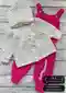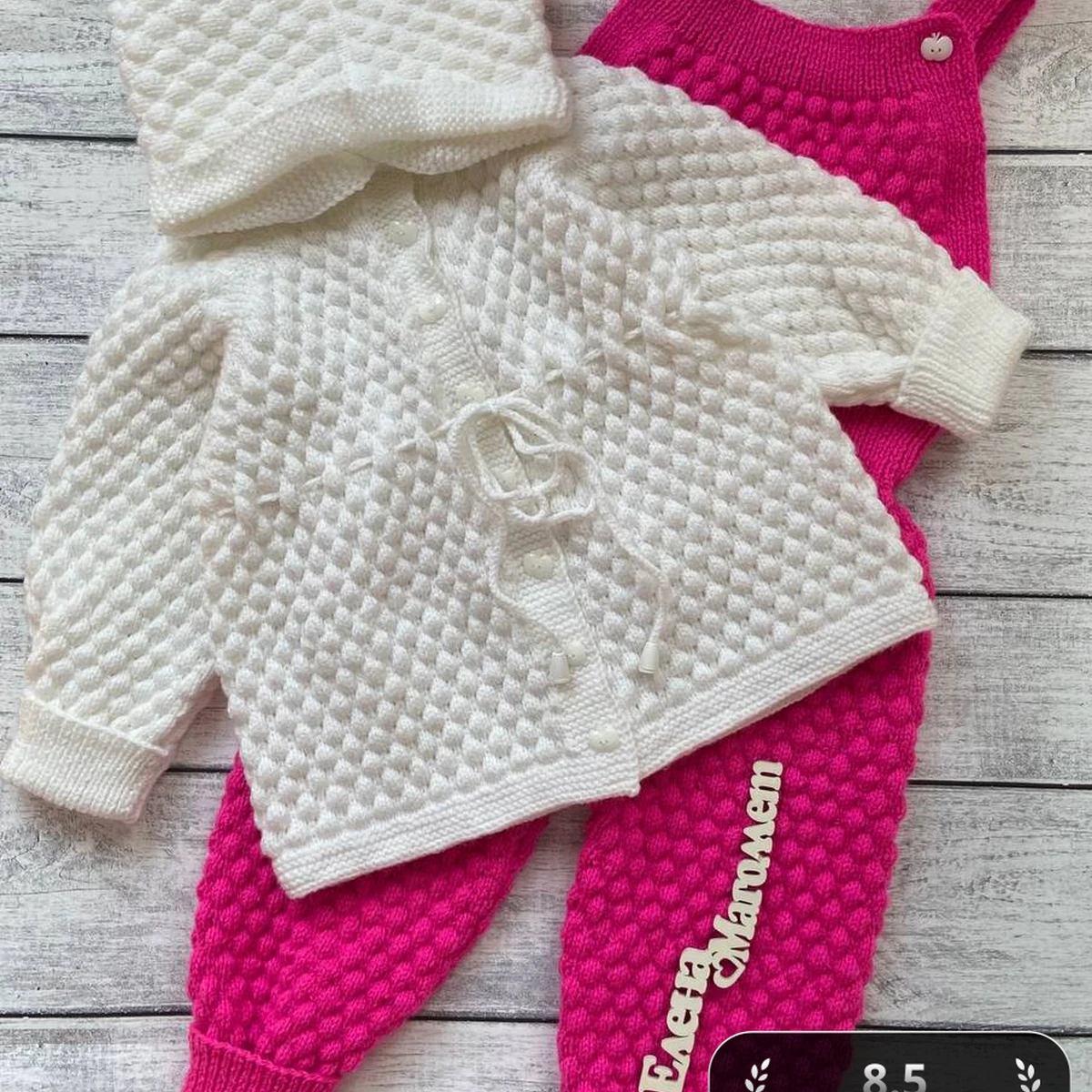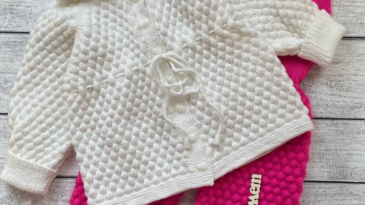 Этот очаровательный комплект для малышей включает в себя уютный белый вязаный жакет с капюшоном и милый розовый комбинезон. Обе вещи выполнены в технике «шишечки», что придает им дополнительную текстуру и объем. Изделия не только функциональны, но и стильны, что делает их идеальными для повседневного ношения малышом.