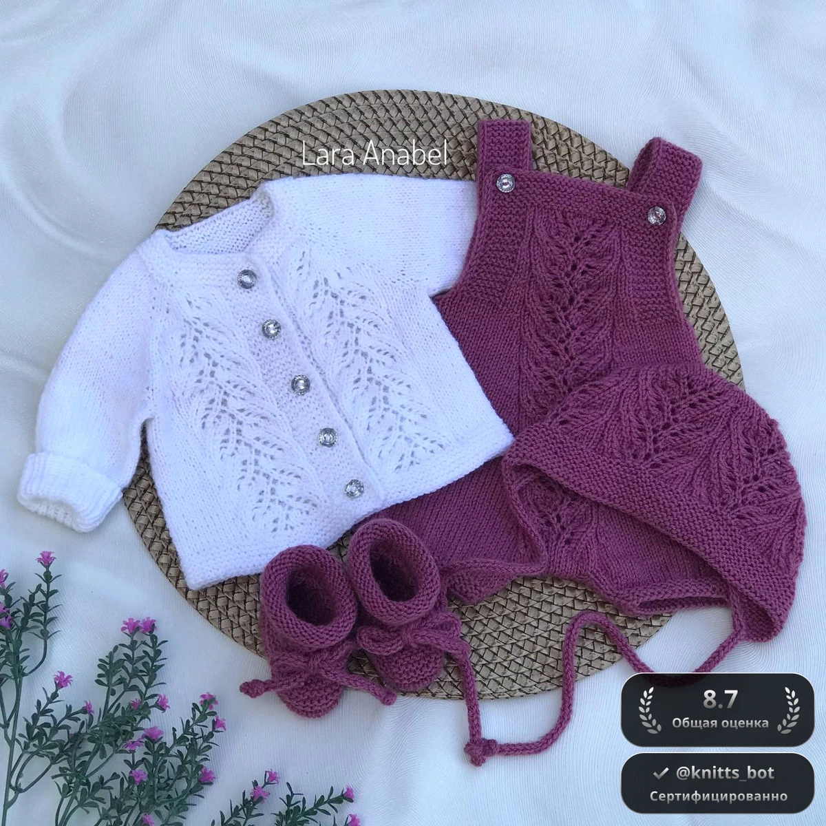 Этот восхитительный комплект для малышей состоит из четырёх предметов: белый вязаный кардиган, розовый комбинезон, шапочка и пинетки. Кардиган украшен красивыми ажурными узорами и блестящими пуговицами. Розовый комбинезон и шапочка выполнены с использованием аналогичного ажурного узора, что придаёт всему комплекту гармоничный и стильный вид. Пинетки дополняют образ, добавляя уют и заботу о малыше. Выглядит очень нежно и прекрасно подойдёт для любого малыша.