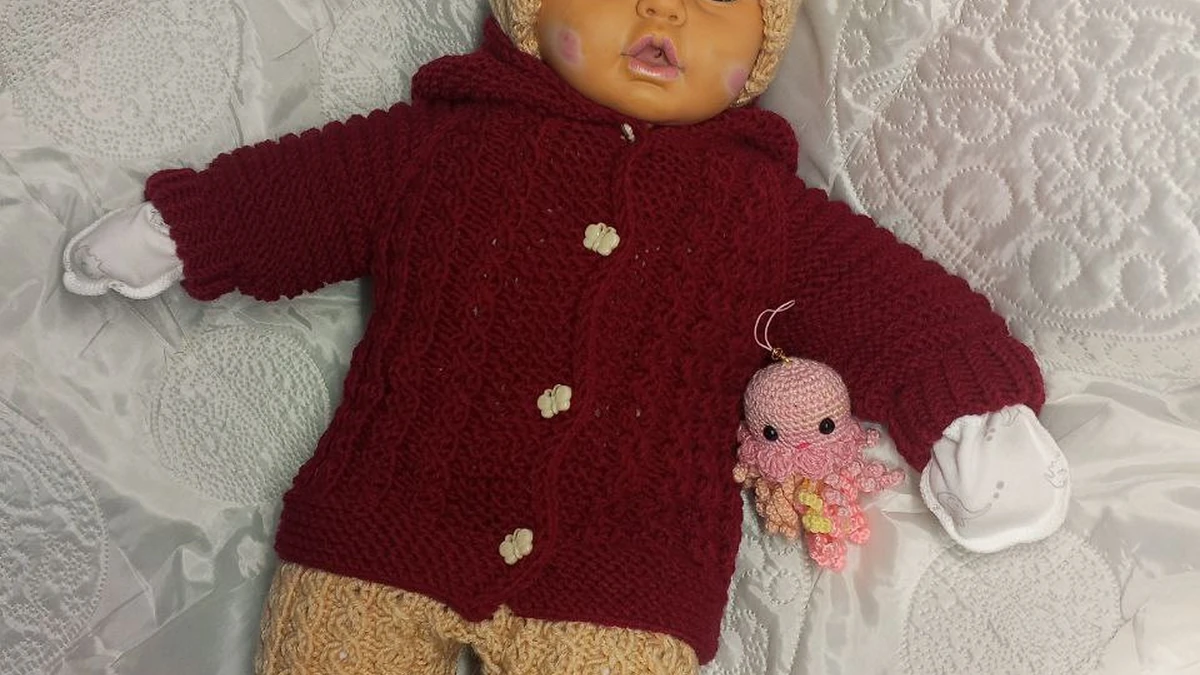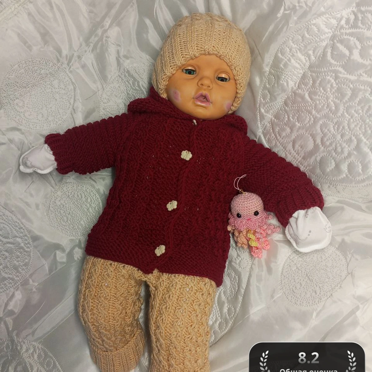 Очаровательный комплект для малыша включает тёплую рубиновую кофточку с капюшоном, фактурными узорами и нежными цветочными пуговками, уютные бежевые брюки с рельефными аранскими косами и широкими эластичными манжетами, а также мягкую шапочку резинкой 2×2, идеально повторяющую цвет брюк. Образ дополняет мини-амигуруми осьминожка в розово-персиковых тонах — милый акцент, который делает изделие ещё более душевным. Контраст глубокого красного и спокойного бежевого смотрится гармонично и празднично, подчёркивая нежность малыша и мастерство автора.
