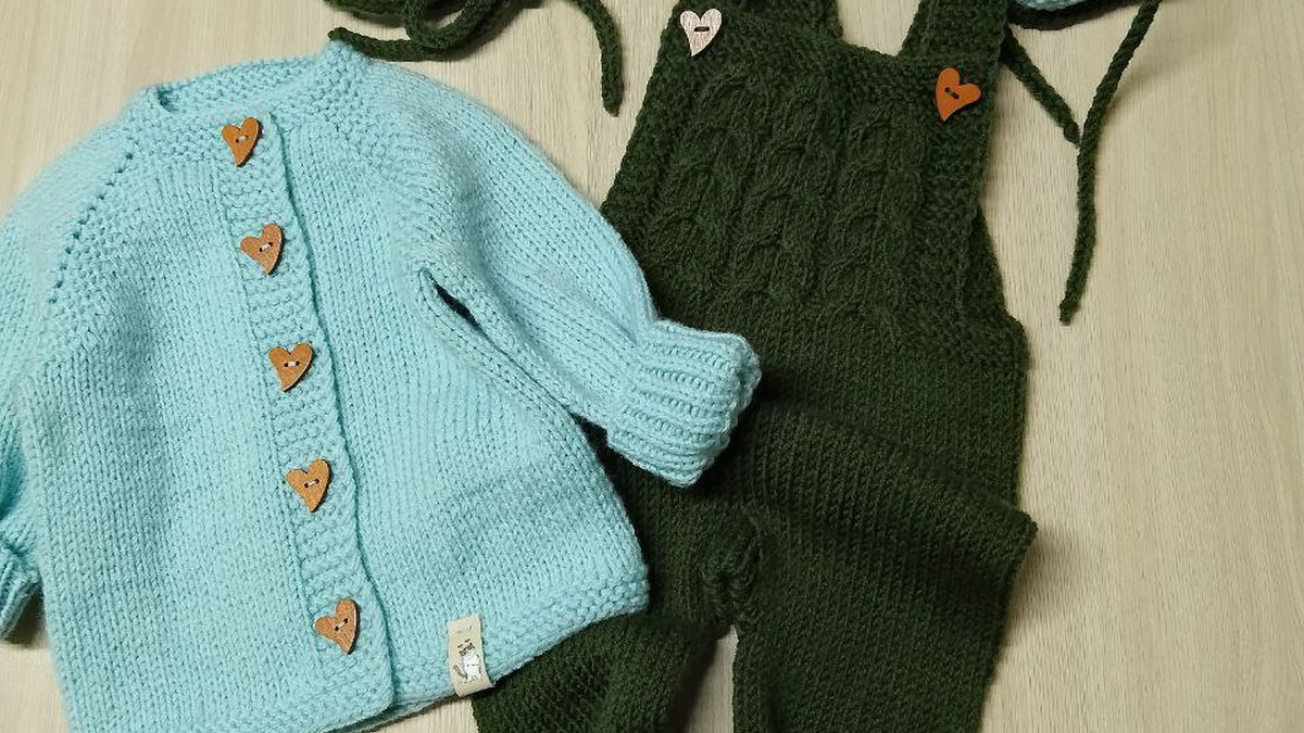 На фото представлено очаровательное детское вязаное комплект, который включает в себя зеленую шапочку, голубую кофточку с пуговками в форме сердечек, милый зеленый комбинезон и парочку голубых пинеток с зелеными акцентами. Эти вещи прекрасно дополняют друг друга, создавая гармоничный ансамбль, который будет не только красивым, но и удобным для малыша.