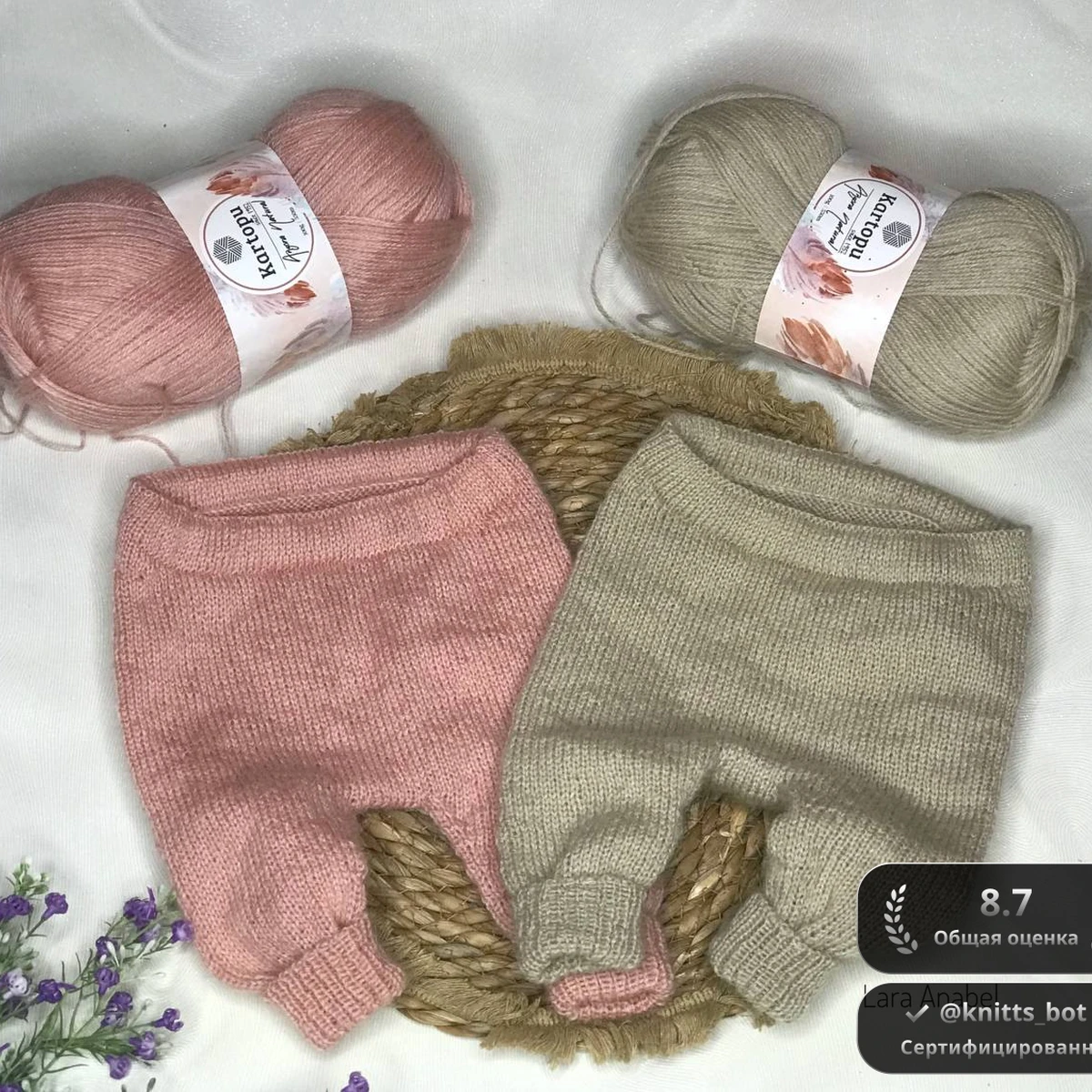 На фотографии представлена пара очаровательных вязанных штанишек для малышей в нежно-розовом и светло-бежевом цветах. Эти штанишки выполнены из мягкой пряжи, обеспечивающей комфорт и тепло для маленьких ножек. На переднем плане также видны клубки пряжи, из которых они связаны, что подчеркивает естественную и уютную атмосферу изделия.