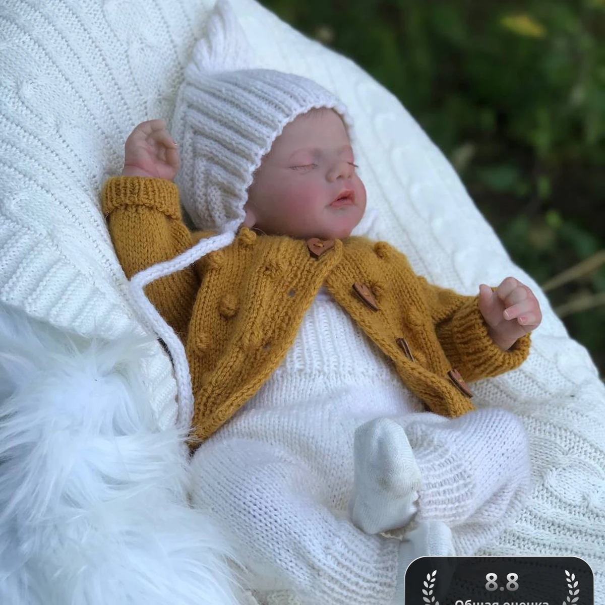 Очаровательный комплект для новорождённого: формованная шапочка-эльф из мягкой полушерсти с выразительной резинкой 2×2, «медовый» кардиган на деревянных пуговках, украшенный милыми шишечками и аккуратными убавками по реглану, а также нежные молочные штанишки и фактурный плед с объёмными косами. Гармоничный дуэт тёплой горчицы и сливочного белого подчёркивает свежесть и уют, а разнообразие фактур – от эластичной резинки до рельефных кос – делает работу особенно притягательной. Видно, что мастер продумал каждую деталь: ровный ритм петель, аккуратные планки, идеальная посадка и качественное доведение до финиша создают цельный, профессиональный образ.