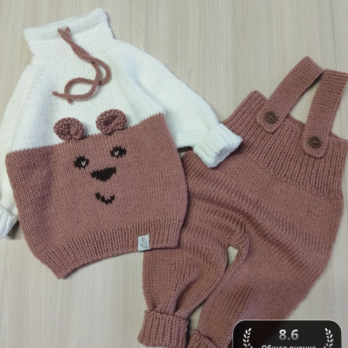 Это очаровательный комплект одежды для малышей, включающий свитер с забавным медвежонком и милые брюки с лямками. Работа выполнена в мягких пастельных тонах с добавлением творчества в виде вышитой мордочки медвежонка, олицетворяющей уют и теплую заботу.