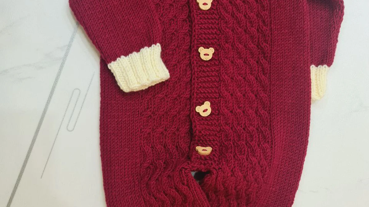 Комбинезон связан спицами из мягкой детской пряжи. Узоры выполнены с использованием классического аранского стиля, что добавляет изделию тёплую текстуру. Эластичные резинки на манжетах и воротнике выполнены резинкой 1х1, что позволяет им оставаться плотными и удобными. Центральная часть украшена ажурным узором, который смотрится стильно и элегантно. Перед началом работы необходимо сделать расчёты и связать образец, чтобы убедиться в правильности плотности вязания. Начинаем вязать с ножек, постепенно добавляя петли для тела, с использованием техники прибавления и убавления петель, что позволяет создать форму. Для застёжки используются деревянные пуговицы, которые придают изделию уникальность и удобство использования. Комбинезон выполнен из акриловой пряжи, которая идеально подходит для детей благодаря своей мягкости и простоте в уходе. Он может быть украшен дополнительными элементами, такими как карманы или капюшон, если это необходимо для дополнительного стиля и функциональности.