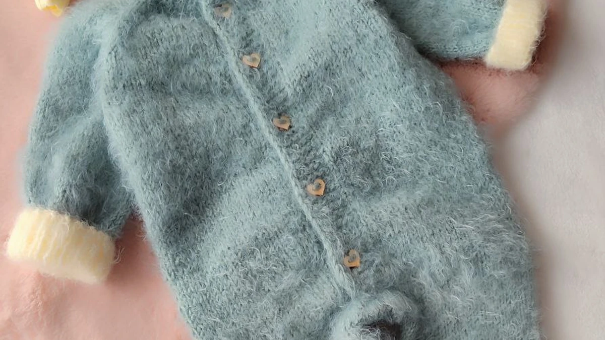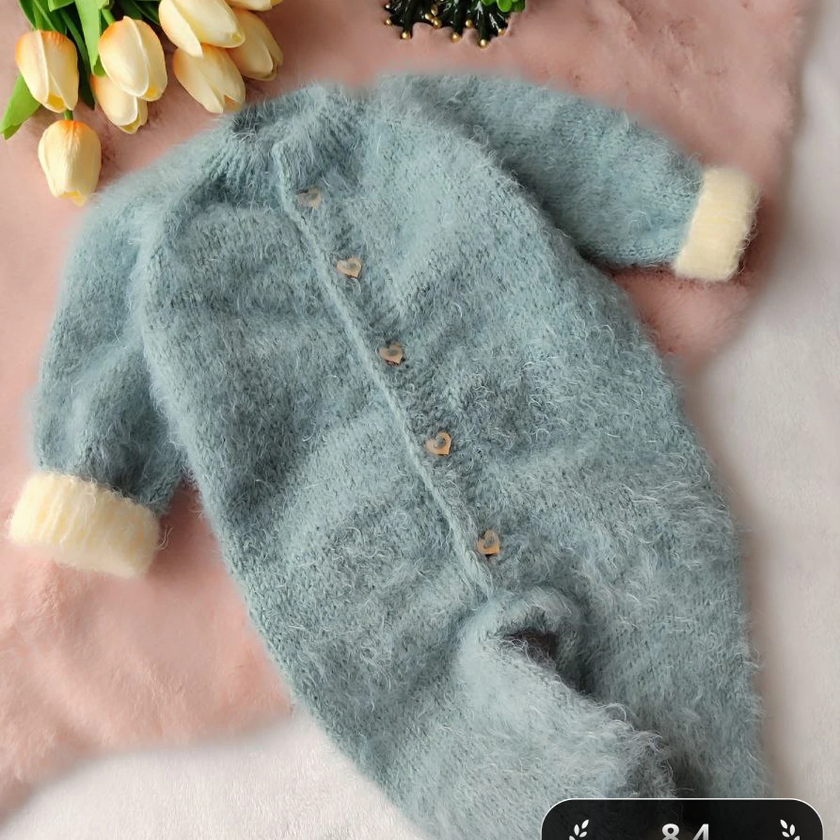 На фото представлен уютный и стильный вязаный комбинезон с длинными рукавами для малыша. Изделие выполнено из нежной, пушистой пряжи приятного светло-голубого оттенка, что придаёт ему мягкость и воздушность. Очаровательные пуговицы в форме сердечек добавляют особую изюминку и делают вещь ещё более привлекательной для малышей. Мягкие манжеты на рукавах и ножках обеспечивают дополнительный комфорт и тепло.