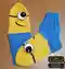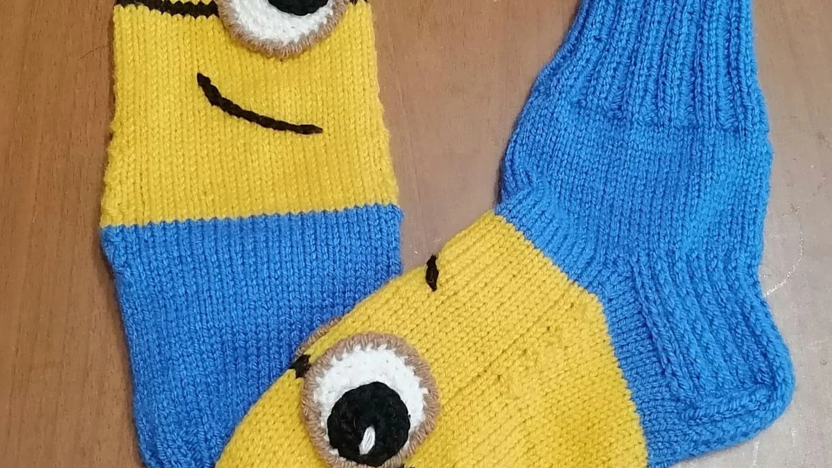 Весёлые носочки, мгновенно узнаваемые по жёлто-голубой раскраске и большому глазу-аппликации, превращают обычный аксессуар в забавного мультяшного помощника. Чёткая линия смены цвета имитирует комбинезон, объёмные ВТО-аппликации глаза созданы крючком и пришиты к мыску, а вышитые чёрной нитью улыбка и «очки» завершает образ. Резинка 2×2 на голени мягко облегает ножку, плотная лицевая гладь по стопе создаёт аккуратное полотно без пропусков. Носочки смотрятся ярко, игриво и идеально подойдут как детям, так и взрослым, которые любят весёлые акценты.