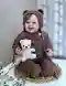 Тёплый «мишуткин» комплект в шоколадном оттенке — комбинезон с закрытыми ножками и уютный чепчик с ушками. Фактура держится за счёт резинок и рельефных элементов, а кокетка украшена аккуратными «шишечками», которые добавляют объёма без перегруза. Посадка выглядит продуманной: манжеты и обвязка по краям ровные, планка с пуговицами чистая, завязки чепчика аккуратно оформлены. Белый плюшевый мишка в кадре удачно поддерживает тему и подчёркивает нежность образа.