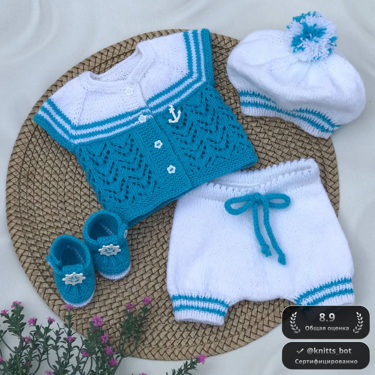 Этот милый комплект для малыша вдохновлен морской тематикой и включает четыре прекрасно связанных предмета: жилет, шапочку, шортики и пинетки. Бодрый бело-голубой цветовой ансамбль создаёт свежий и радостный образ. Каждый элемент тщательно проработан, с вниманием к деталям, что делает набор не только практичным, но и стильным.