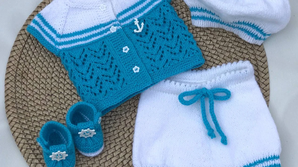 Этот комплект связан спицами с использованием сочетания лицевых и изнаночных петель, создавая мягкость и текстурность изделия. В основе жилета использован ажурный узор, придающий легкость и воздушность. Шапочка выполнена резинкой 1х1 для идеальной посадки и дополнена помпоном, гармонирующим по цвету с общей гаммой. Шорты и пинетки выполнены гладью, что придаёт изделию нежность, а нитка контрастного цвета по краям подчёркивает морскую тематику.