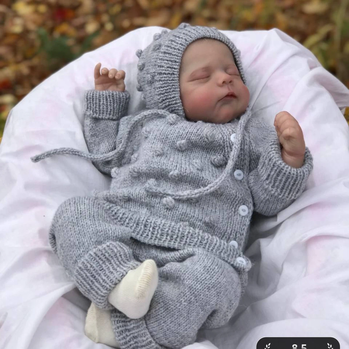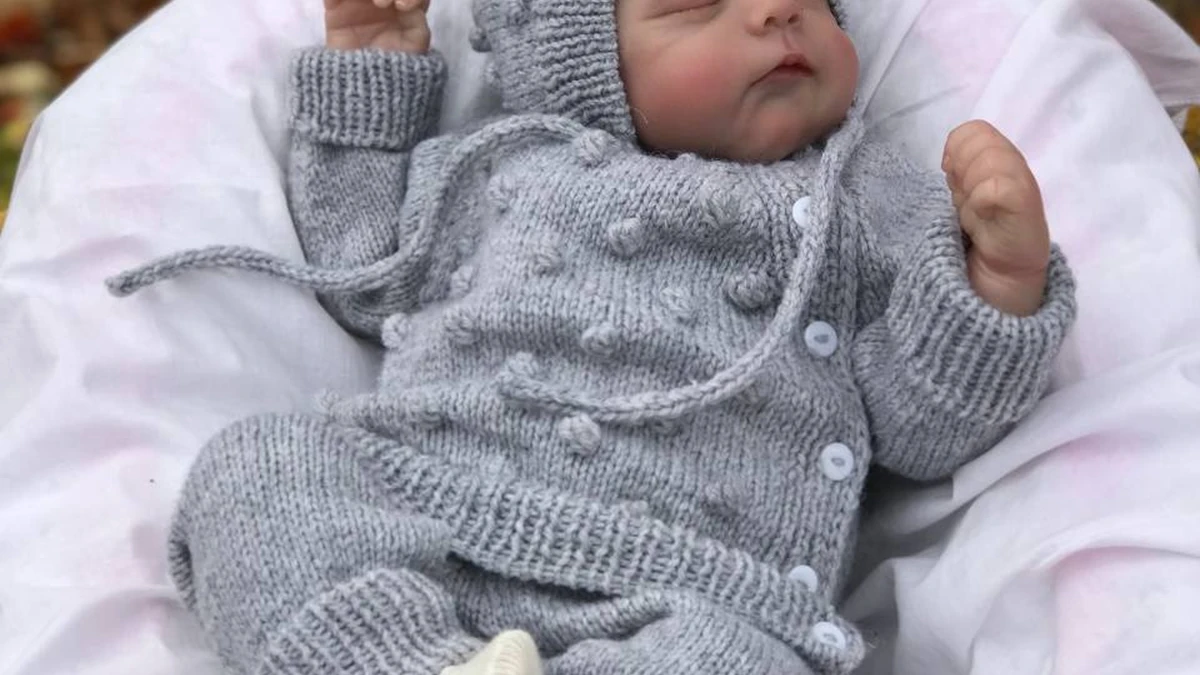 На изображении представлено уютное вязание для младенца: комбинезон и шапочка, выполненные в светло-сером цвете. Комплект украшен оригинальными выпуклыми узорами, напоминая классический стиль. Это идеальный выбор для прохладной погоды, чтобы держать маленького ребенка в тепле и комфорте.