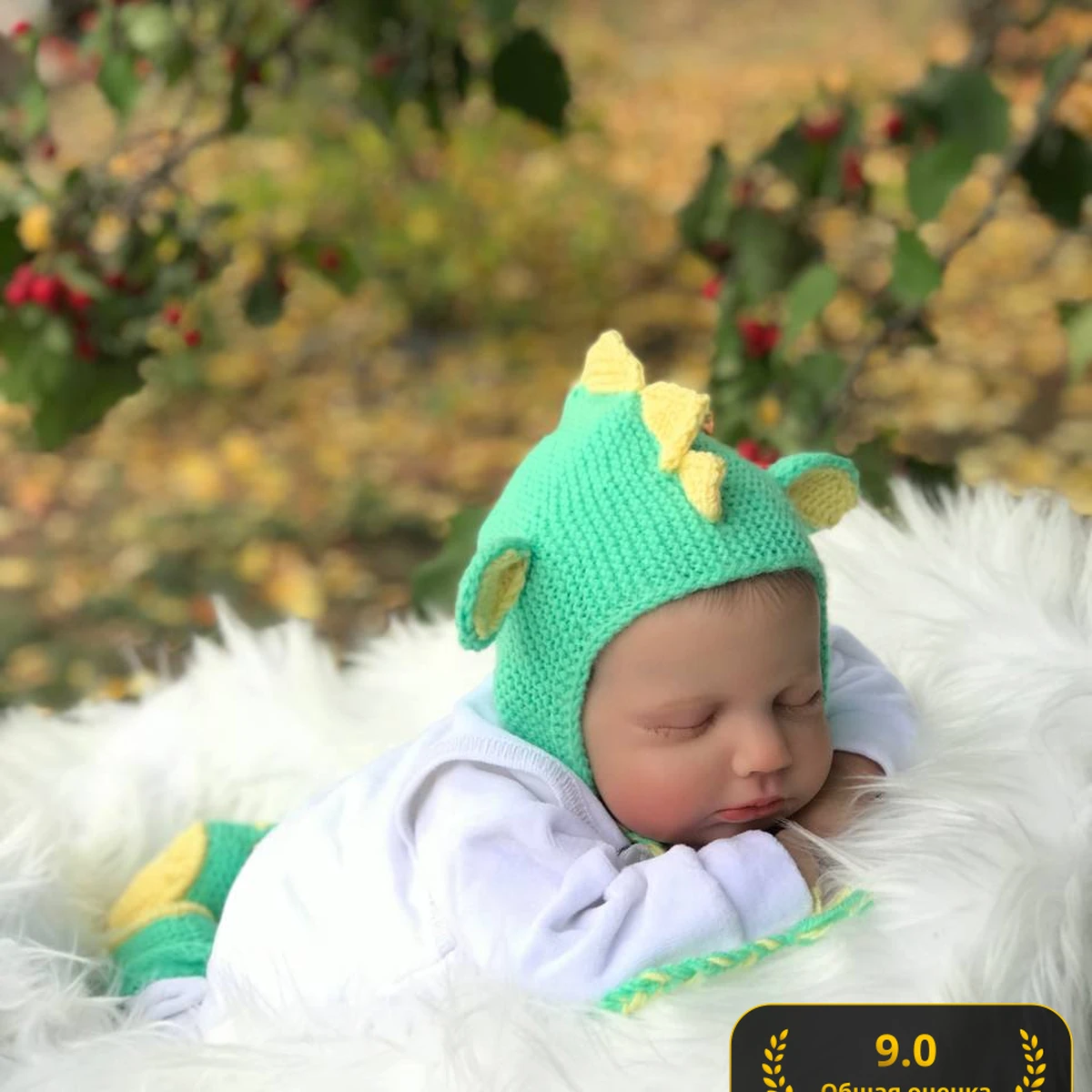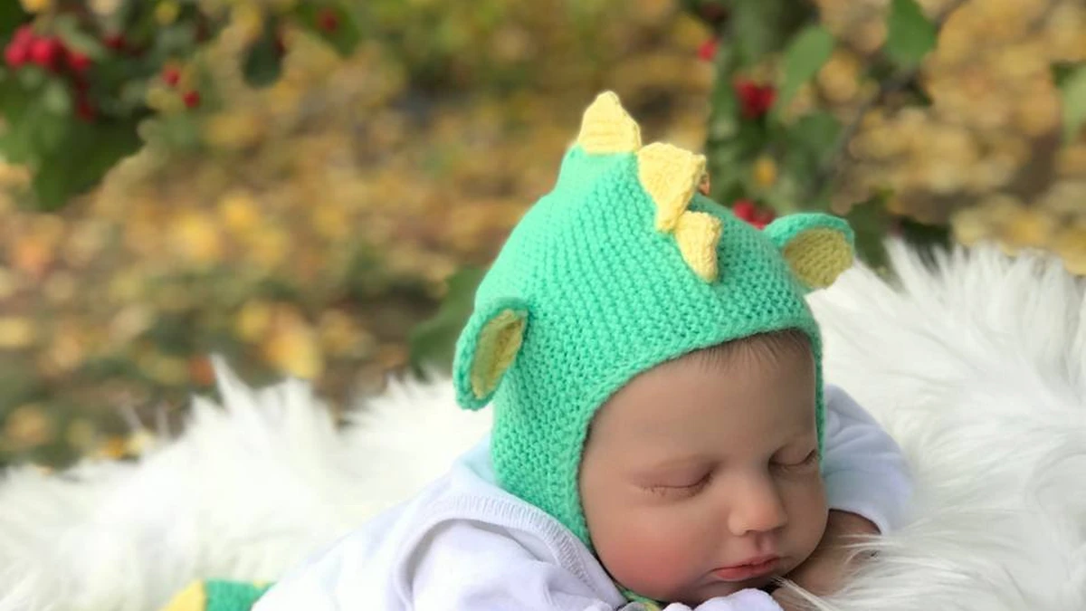 Перед нами очаровательный комплект для новорождённого в стиле «маленький динозавр»: мятно-зелёный чепчик-капор с ушками и зубчиками, дополненный хвостиком той же расцветки. Плотная платочная вязка создаёт упругую текстуру и отлично держит форму, а мягкая детская пряжа бережно касается кожи. Яркие жёлтые шипы и подкладка ушек выступают приятными акцентами и делают образ по-настоящему сказочным. Идеальная модель для нежной фотосессии: малыш выглядит уютно и забавно, а контраст с пушистым белым фоном подчёркивает сочность цвета.