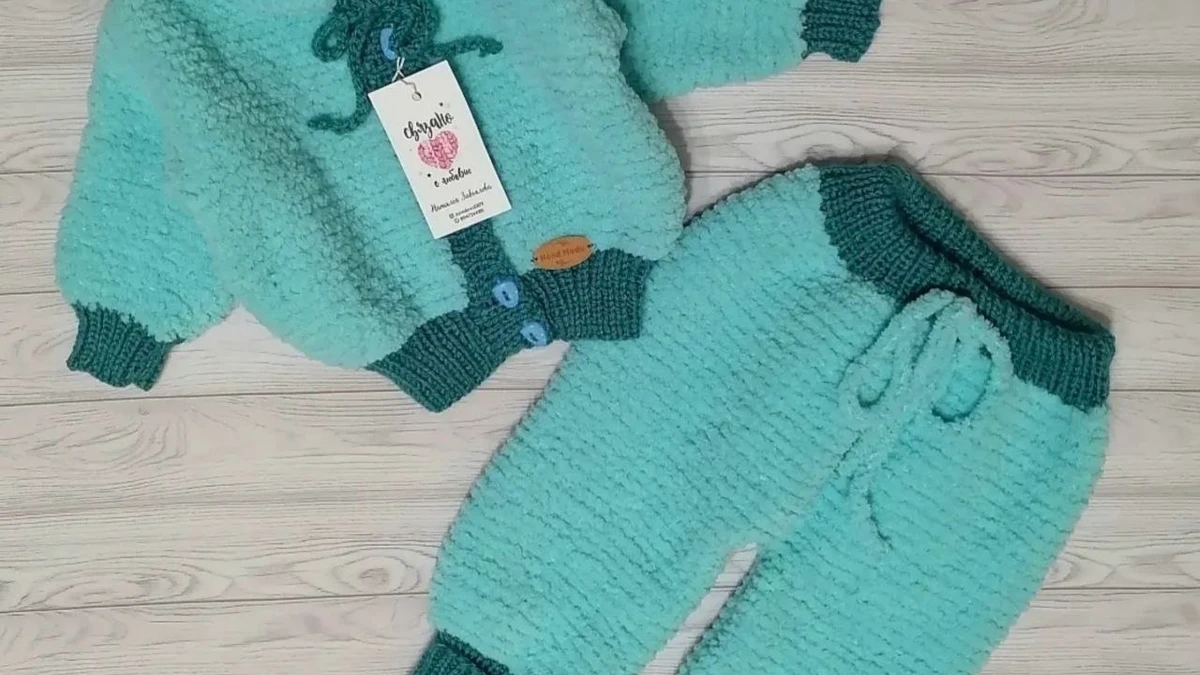 Основное полотно связано спицами №5 из микрополиэстеровой плюшевой пряжи с коротким ворсом, создающей бархатистую «таблеточную» структуру. Для обеспечения стабильности изделия использован классический платочный край по линии горловины и боковых швов, что предотвращает растягивание мягкой нити. Курточка вяжется снизу вверх единым полотном до пройм, после чего петли спинки и полочек разделяются; проймы формируются плавными убавками по технологии «английская скос проймы». Рукава вывязаны по окату методом втачивания сверху, что позволяет избежать лишних швов и обеспечить аккуратную посадку. Планка выполнена резинкой 1×1 с итальянским набором и двойным закрытием иглой – эластичный и эстетичный результат. Контрастные манжеты, нижняя планка и пояс штанишек связаны из полушерстяной пряжи того же метража на спицах №3,5 резинкой 2×2. Переход между плюшем и гладкой пряжей закреплён скрещенными петлями, чтобы предотвратить разъезжание. Пояс штанов снабжён кулиской: петли для шнура провязаны «дырочками» (накид + 2 вместе), а шнур изготовлен ай-кордом в три петли. Штанишки вывязаны по укороченным рядам в области сидения для дополнительного объёма под подгузник и плавного прилегания.