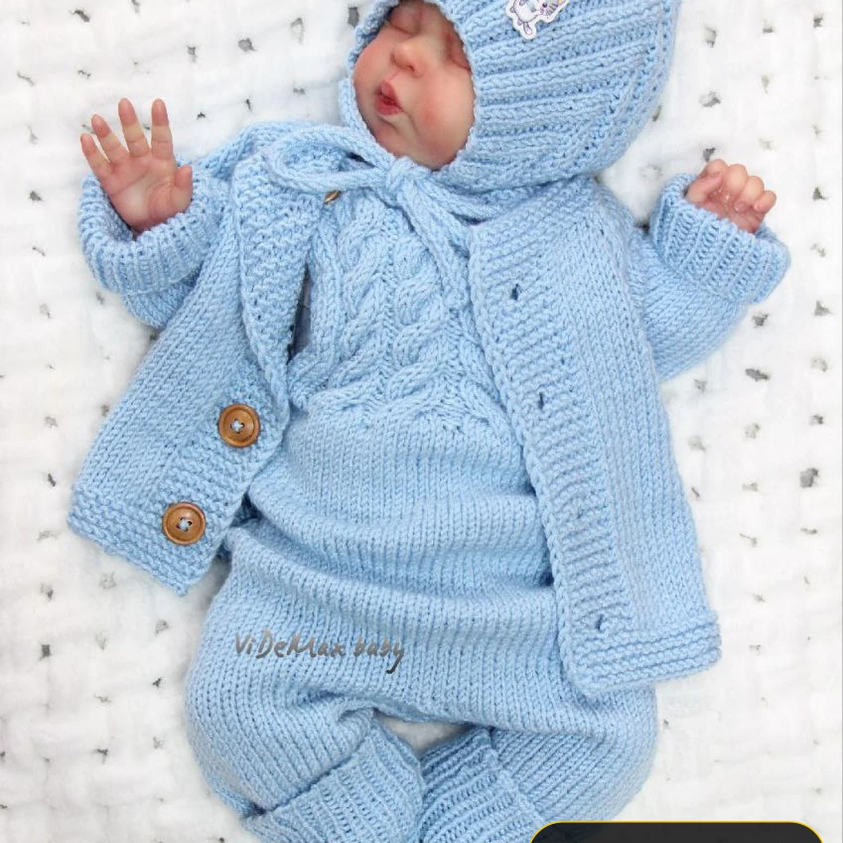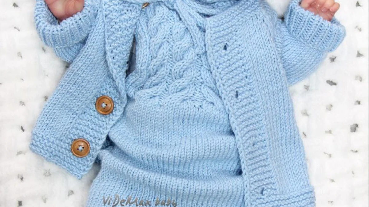 Очаровательный комплект для новорождённого в небесно-голубом цвете включает шапочку-эльфийский колпачок с завязками, джемпер с выразительными объёмными арановыми косами, мягкие штанишки с цельновязанными следочками и уютную короткую кофточку на деревянных пуговицах. Все детали выдержаны в едином стиле: ровная резинка 1×1 подчёркивает манжеты и низ, а аккуратная планка платочной вязкой придаёт жакетке опрятность. Плавные переходы между элементами, ровная плотность полотна и безукоризненные убавки на макушке шапочки демонстрируют уверенное владение спицами и внимательность к мелочам. Такой комплект выглядит мягким, тёплым и по-настоящему заботливым, идеально подходя для первых фотосессий малыша или ежедневных прогулок.