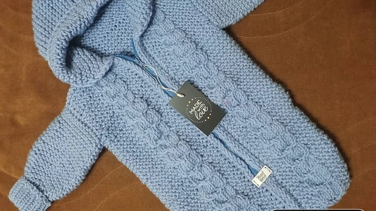 Конверт связан спицами сверху вниз единым полотном, что минимизирует швы и делает изделие максимально комфортным для малыша. Начало – с капюшона: набрано число петель по объёму головы и провязаны 6-8 см платочной вязкой. Формирование округлой макушки выполнено укороченными рядами с последующим трёхспицевым закрытием, получился аккуратный казаку-шов. Далее петли капюшона соединены в круг, набраны дополнительные по переднему краю и работа продолжена прямыми и обратными рядами до пройм. Для рукавов использован классический метод вывязывания от проймы – петельки набраны по краю и вывязаны по кругу до манжета, что позволяет избежать лишних соединительных швов. Основное полотно выполнено платочной вязкой: все ряды лицевые, обеспечивая высокую плотность и упругость. Центральный декоративный элемент – полоса из рельефных «квадратных» кос: повторяющийся раппорт 8 петель и 12 рядов, где перекрещивания выполняются крючком без дополнительной спицы для ускорения работы. По линии молнии провязан двойной кромочный край: первые и последние три петли каждого ряда образуют ровную кромку, затем внутренняя подгибка пришита потайным швом. Нижняя часть изделия формирована одновременным убавлением по бокам каждые 6 рядов, создавая овальную форму кокона. Закрытие петель – иглой методом «петля в петлю» для эластичного края.