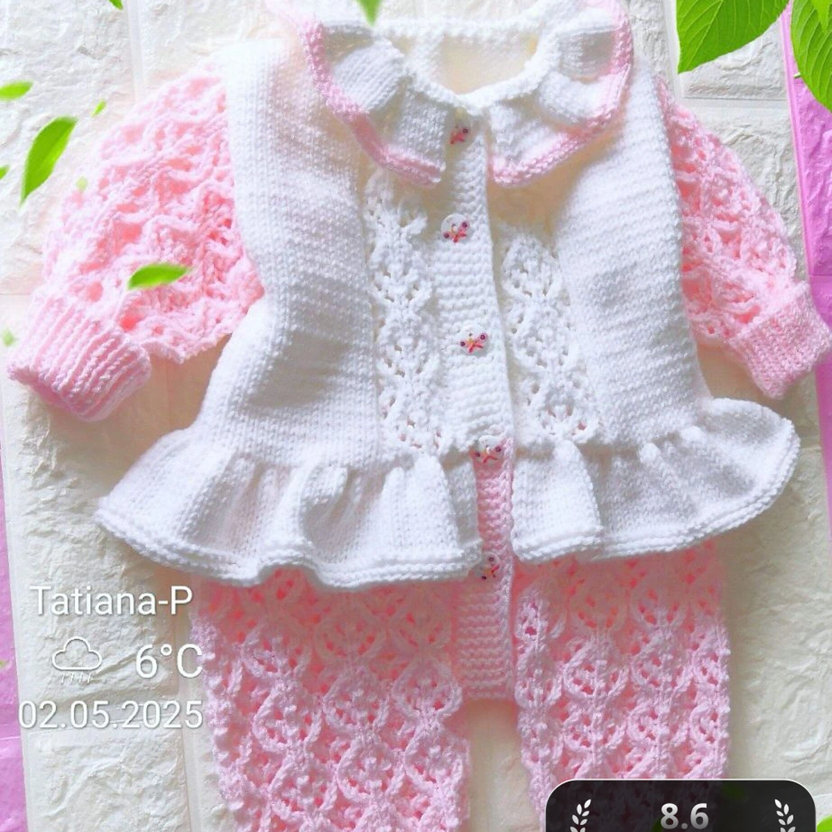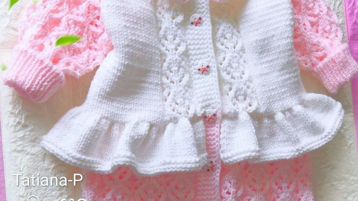 Этот очаровательный комплект для младенца состоит из жакета и штанишек пастельных цветов. Выполненный из мягкой пряжи, комплект идеально подойдет для теплого весеннего дня. Белый жакет украшен ажурными вставками, рюшами по низу и воротнику, придавая ему воздушность и изящество. Розовые штанишки вяжутся ажурным узором, который гармонично дополняет жакет, создавая нежный и уютный ансамбль.