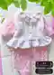 Комплект выполнен с использованием машинного вязания. Основной акцент сделан на ажурные узоры, которые вписываются в общий стиль мягкости и легкости. Белый жакет связан из пряжи средней толщины, которая обеспечивает необходимую плотность и форму. Рюши добавляются на заключительных этапах, чтобы сохранить объем и дополнить текстуру. Розовые штанишки выполнены ажурным узором, который повторяет элементы жакета, создавая гармоничный ансамбль. Основной сложностью является комбинирование плотных и ажурных участков так, чтобы они не конфликтовали друг с другом по объему и стилю.