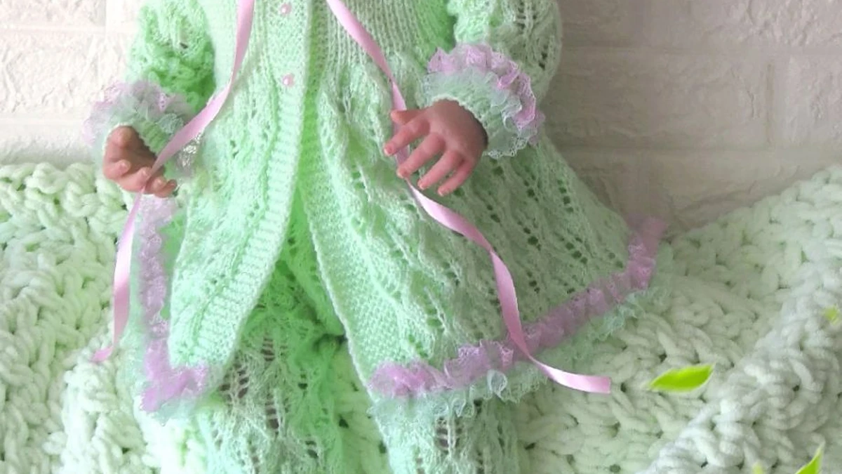 Для вязания этого комплекта использованы техники ажурного вязания и вязания резинки, что придает изделию как строгость, так и воздушность. Ажурный узор напоминает лёгкие кружевные мотивы, которые добавляют изделию изящность. При выполнении резинки на манжетах и краях изделия усиливается плотность, что обеспечивает комфорт при носке. Распределение узоров выполнено так, чтобы подчеркнуть форму изделия и создать гармоничное сочетание кружев и плотных участков. Ажурный узор следует по центральной части и рукавам жакета, плавно переходя на штанишки, а резинка вокруг шеи и манжет добавляет аккуратной завершенности общему виду. Связывание всех элементов вместе требует внимания к деталям, чтобы создать симметрию и равномерность во всех частях комплекта. Ленточки и кружево добавлены для декоративного эффекта, они тщательно закреплены по линии пуговиц и вокруг шапочки для достижения завершенного образа.