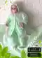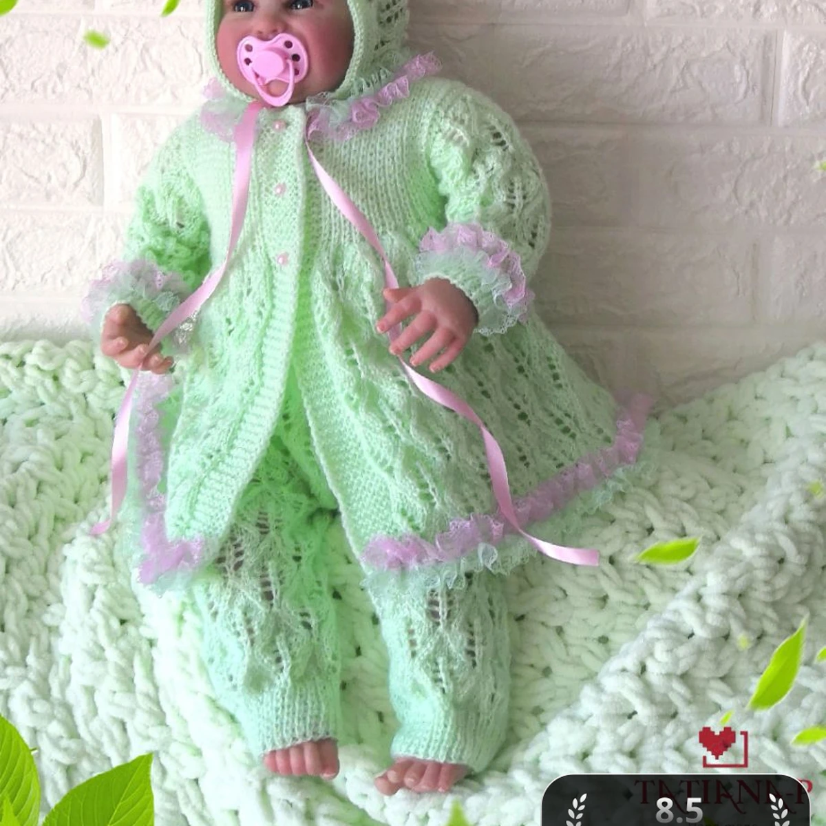 Этот очаровательный комплект представляет собой детский комплект, состоящий из шапочки, жакета и комбинезона. Все элементы выполнены в нежном мятном цвете с добавлением розовых ленточек и кружева, что придает одежде нежный и привлекательно романтичный вид. Костюм идеально подойдет для младенца и станет прекрасным подарком для новорожденного.