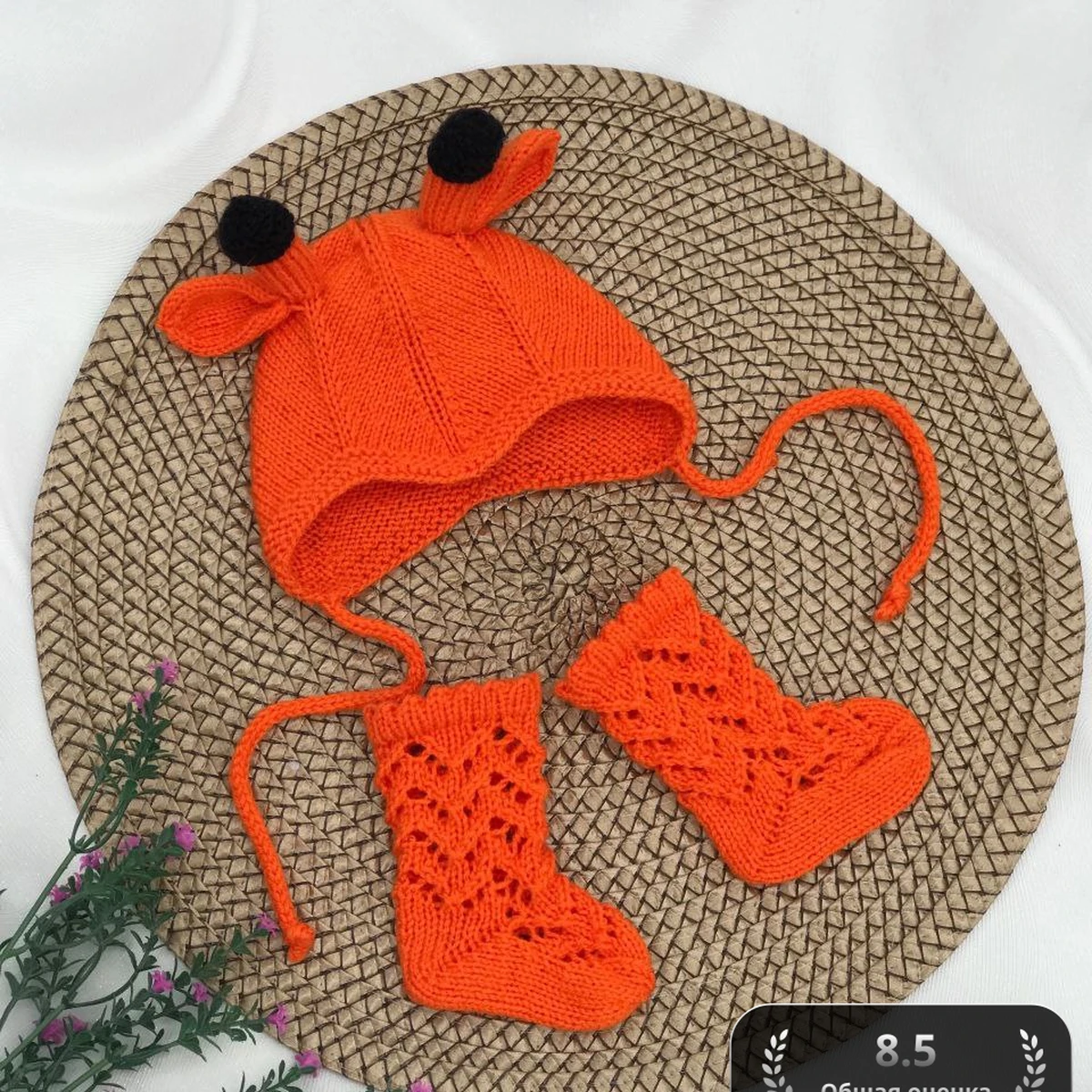 Шапочка и пинетки выполнены лицевой гладью с использованием круговых спиц. Для создания ушек использована техника "укороченных рядов", создающая их форму без лишних швов. Ажурный узор на пинетках создан при помощи накидов и убавок, формирующих повторяющийся мотив. Пряжа средней толщины использована для плотного и тёплого полотна, что особенно важно для детских вещей. Оранжевый цвет придает изделию яркость и жизнерадостность, в то время как черные акценты в виде помпонов добавляют игривости и контраста. Вся работа требует внимания к деталям, особенно в создании симметричных мотивов и ровных краев. Шапочка вяжется от верха к низу, начиная с формирования макушки. Пинетки начинаются с манжеты и вяжутся вниз, формируя стопу и подошву за счет укороченных рядов и убавок. Ушки и помпоны выполнены отдельно и пришиты в конце.