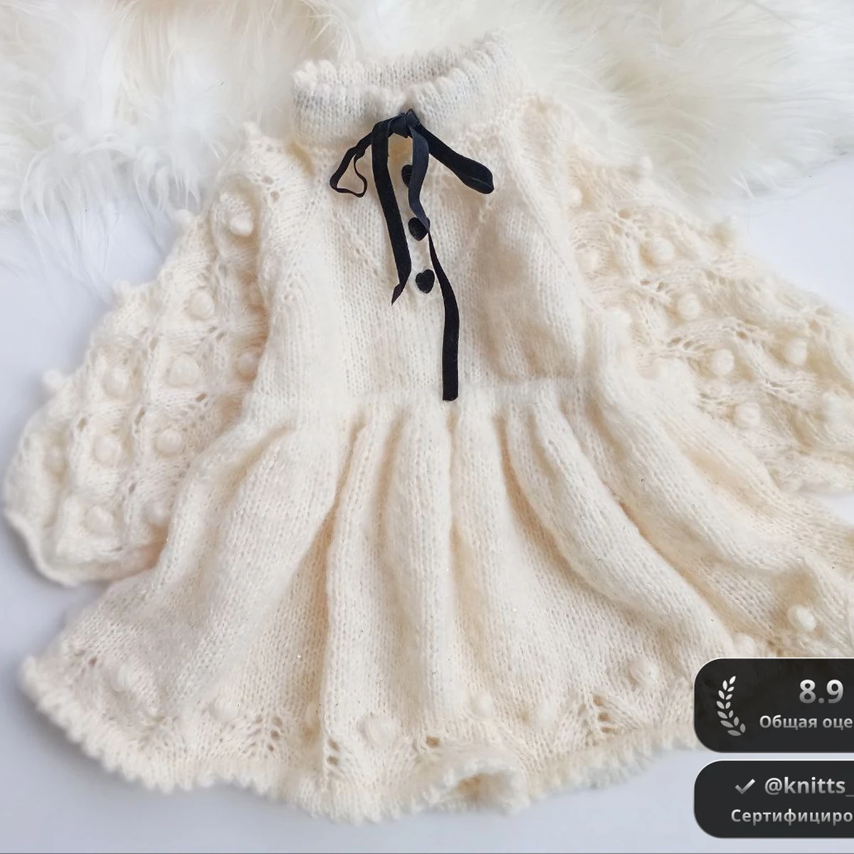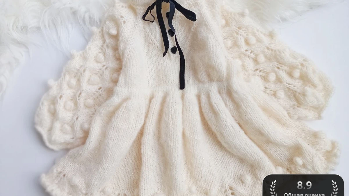 На фото изображено очаровательное вязанное платье для малышей из мягкой и пушистой пряжи. Оно украшено красивыми узорами и ажурными рукавами, создающие романтический и нежный образ, который идеален для особых случаев или фотосессий. Чёрный бантик добавляет стильную деталь, подчеркнув элегантность изделия.