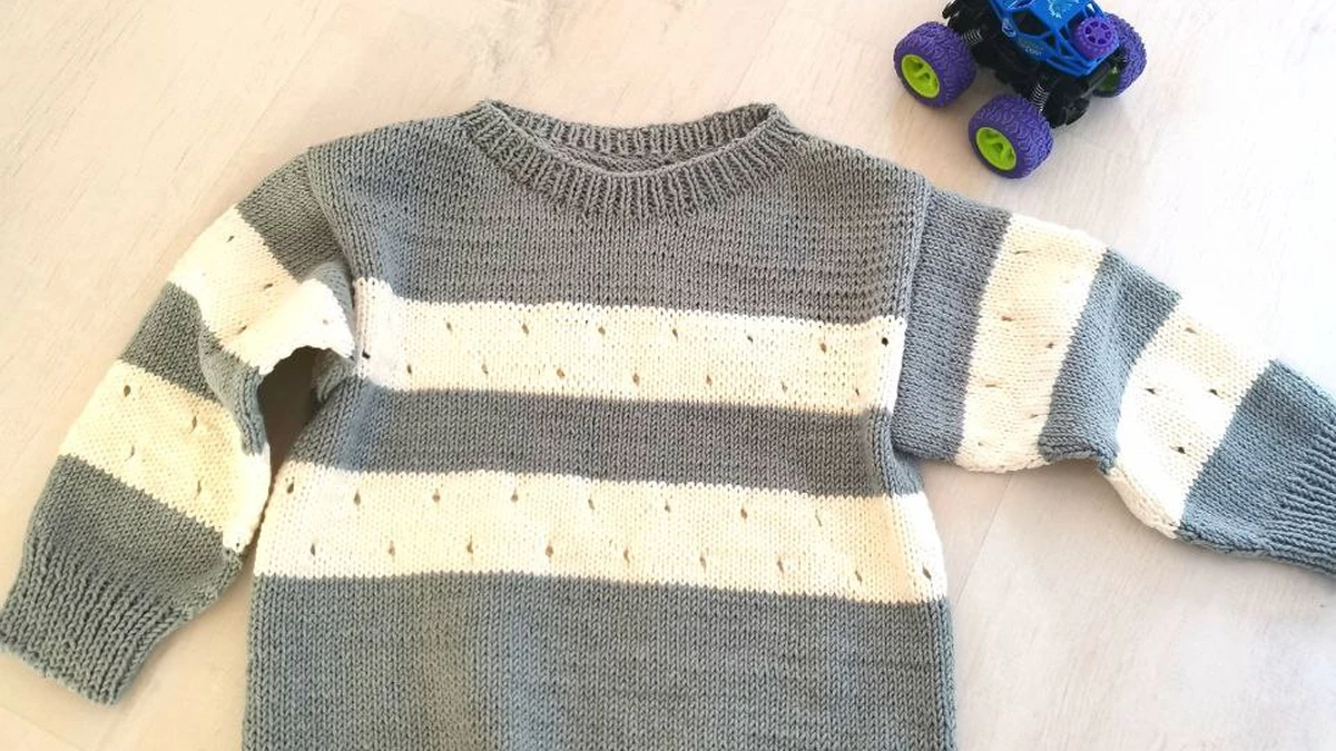 Этот очаровательный вязаный свитер, выполненный с горизонтальными полосками, станет отличным дополнением детского гардероба. Изготовленный в технике чулочной вязки, он сочетает в себе функциональность и стиль. Светло-голубой и кремовый цвета создают мягкий и успокаивающий эффект, идеально подходящий для весенне-осенних прогулок.