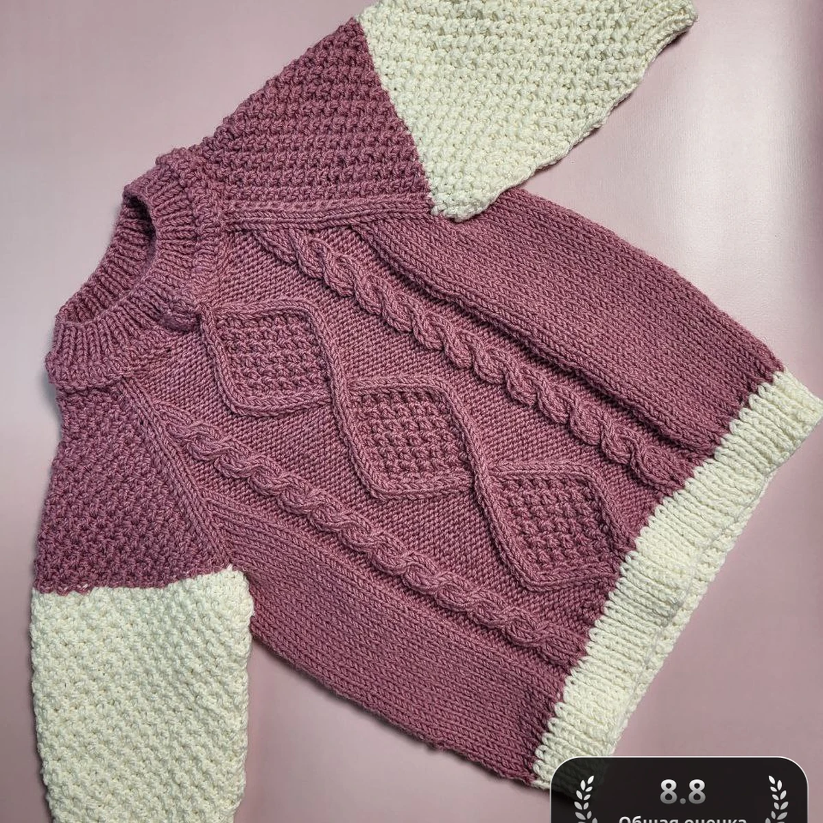 Свитер связан частями снизу вверх классическим способом. Тело выполнено лицевой гладью с центральной вставкой: по краям идут рельефные жгуты 4×4, между ними — цепочка ромбов, сформированных перекрещиваниями петель через каждые 10 рядов. Внутри ромбов — крупная «шишечка» (cluster) на базе вытянутых петель, что создаёт пупырчатую текстуру. Рукава вяжутся прямым полотном, верхняя пудровая часть — плотная рисовая вязка (1 лиц, 1 изн со смещением), переходящая в кремовый блок той же фактуры. Манжеты и горловина выполнены эластичной резинкой 1×1 с закрытием иглой по методу Элизабет Циммерман. Сборка выполнялась трикотажным швом «петля в петлю» по плечам и бокам, что делает швы почти невидимыми и сохраняет растяжимость. Все концы пряжи заправлены иглой в структуру жемчужной вязки для надёжного закрепления.