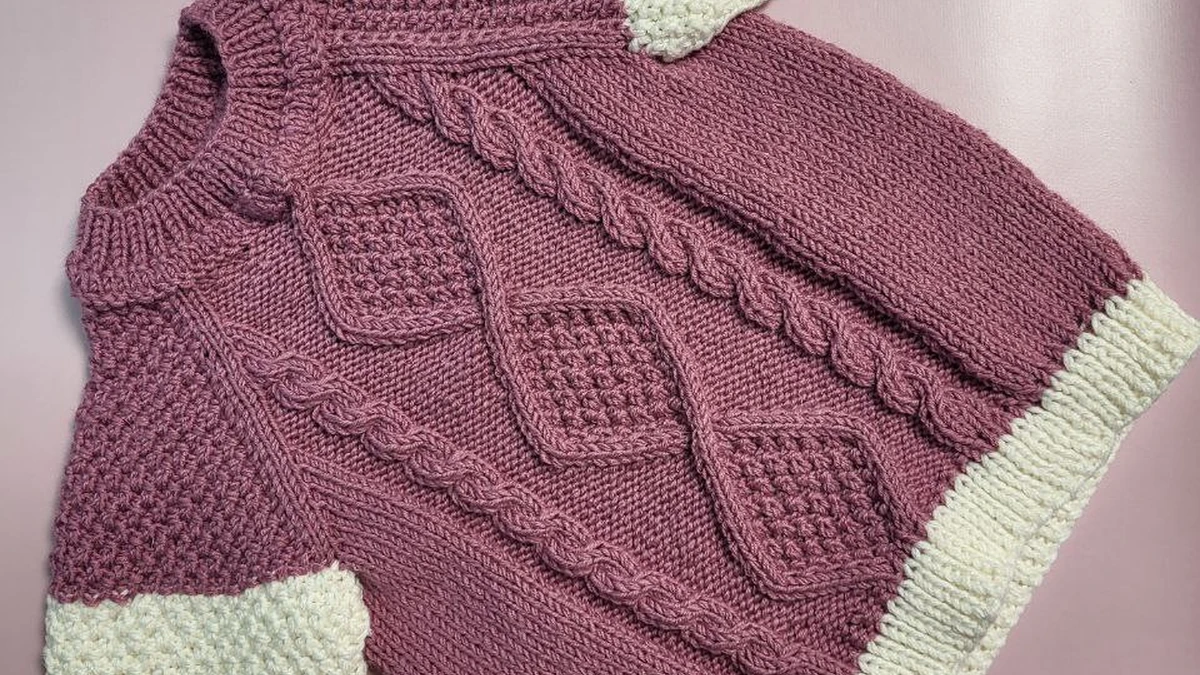 Очаровательный детский свитер в винтажном духе: основная пудрово-сливовая часть украшена крупными ромбами со структурным наполнением и выразительными жгутами, создающими объём и динамику. Контрастные молочно-кремовые манжеты, низ и верх рукавов связаны жемчужной вязкой, добавляя фактурной игры и подчёркивая рукав «фонарик». Воротник-резинка гармонично завершает образ, делая изделие уютным и аккуратным.
