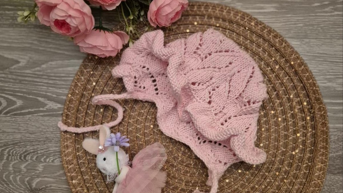 Нежный ажурный чепчик пудрово-розового оттенка — очень «воздушная» вещь для малыша: листики в узоре читаются, фактура аккуратная, завязки добавляют удобства и милоты. Полотно выглядит ровным, ажурные дорожки выстроены чисто, а край смотрится мягко и по-детски деликатно. Стилизованная раскладка с цветами и спокойным фоном выгодно подчёркивает оттенок пряжи и делает работу почти готовой к витрине.