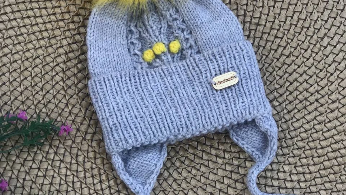 Шапочка связана из мягкой пряжи средней толщины лицевой гладью с добавлением отдельных рельефных узоров, которые придают текстуру и структурный интерес. Верх изделия украшен крупным помпоном, что добавляет динамичности внешнему виду. Использованы спицы среднего размера, которые позволяют достигать ровности и точности в вязании. Декоративные элементы выполнены в виде трёх шариков перед шапкой, которые делают её уникальной и придают дополнительный акцент. Уши шапочки связаны аккуратными жгутами и плавно переходят в завязки, что делает изделие не только красивым, но и функциональным, обеспечивая тепло и комфорт. Каждая петля усилена дополнительной нитью для увеличения долговечности и формы изделия. Комбинация основного серого цвета с ярким жёлтым акцентом на помпоне подчеркнута тщательной стыковкой цветных переходов, что свидетельствует о высоком уровне мастерства и внимании к деталям. Вся структура шапочки оформлена чёткими краями, что делает её подходящей для повседневного использования и особенных случаев.