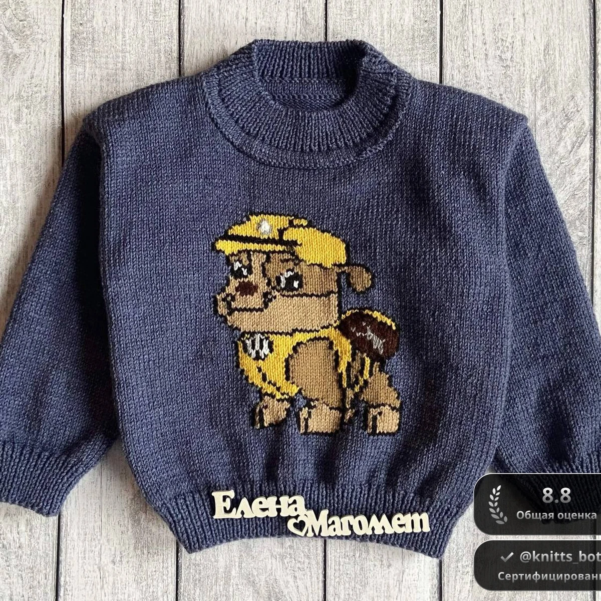 На фото — аккуратный детский свитер тёмно-сине-графитового оттенка, выполненный лицевой гладью с широкой резинкой по горловине, манжетам и низу. Главный акцент — крупная интарсия с щенком в жёлтой каске: цвета подобраны контрастно и «читаются» с первого взгляда, образ очень дружелюбный и узнаваемый. Полотно в целом ровное, резинки держат форму, посадка выглядит мягкой и уютной. Снимок удачный: изделие разложено на нейтральном деревянном фоне, всё хорошо видно и без лишних деталей.