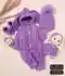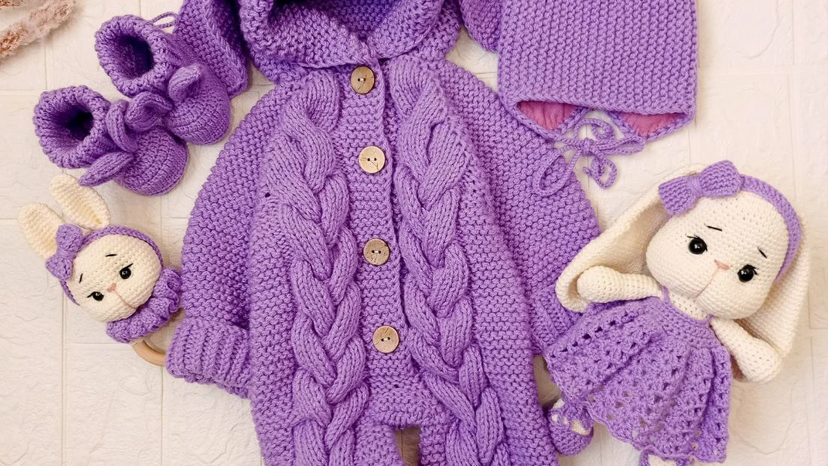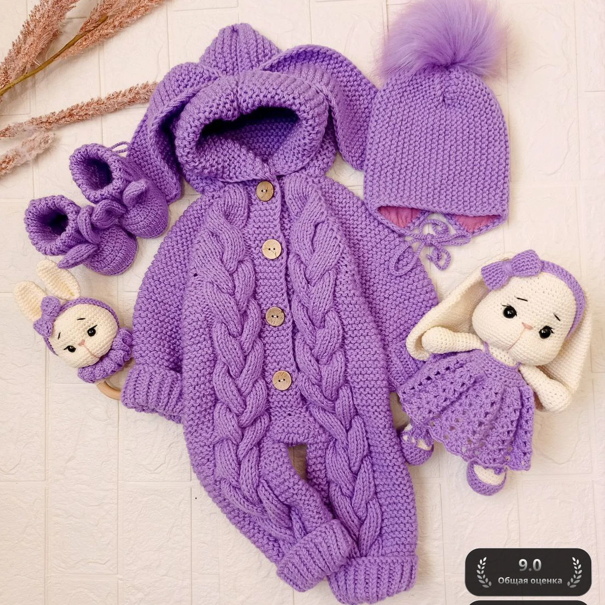 Этот комплект вязаных изделий включает в себя милый комбинезон с капюшоном на пуговицах, шапочку с помпоном, маленькие пинетки и две игрушки-зайца. Все элементы выполнены в уютной сиреневой гамме, что придаёт всему комплекту гармоничный и нежный вид. Особое внимание привлекают косы на комбинезоне, добавляющие объема и текстуры. Вязаные игрушки-зайцы с такими деликатными деталями и милыми выражениями лиц безусловно завоюют сердце каждого, кто их увидит.