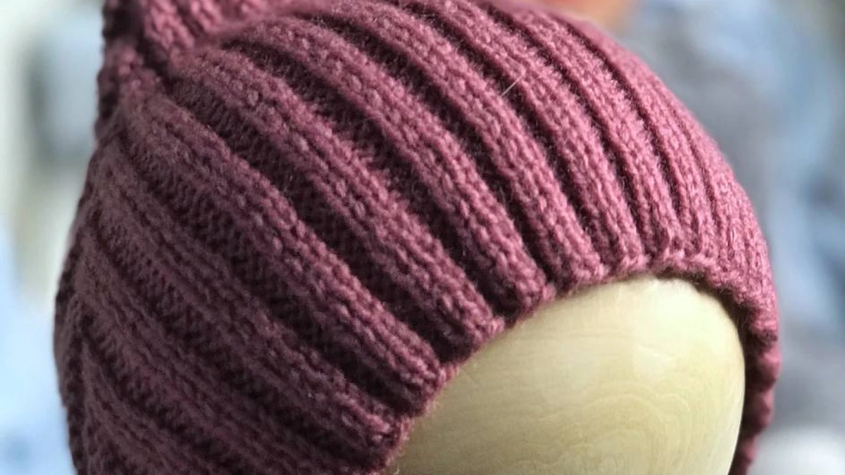 Шапочка выполнена классическим круговым вязанием без швов. Сначала набран эластичный край методом «Tubular Cast-On» спицами на 0,5 мм тоньше рабочих, что обеспечивает мягкий переход и отсутствие стянутых петель. Основная часть вяжется по спирали резинкой 1×1: лицевая петля за переднюю стенку, изнаночная — классическая, что создаёт чёткий ровный рубчик. Благодаря однородному натяжению мериносовая нить ложится плотным, но при этом воздушным полотном, хорошо удерживающим форму. После вывязывания нужной глубины выполняется формирование макушки методом последовательных тройных убавок через ряд в шести секторах, из-за чего петли сходятся в выразительный «гребешок». Для плавности линии убавки делаются из двух лицевых вместе с наклоном, чередуясь с протяжкой, сохраняя рисунок резинки. Закрытие завершено методом «Kitchener Stitch» для полного отсутствия грубого шва. Завязочки – это i-cord шнур по три петли на чулочных спицах, пришитый крестообразным способом за крайний наборный ряд, что усиливает фиксацию. Вся работа велась на круговых спицах 3 мм из нержавеющей стали длиной 40 см. В конце изделие прошло влажно-тепловую обработку через пар, без давления, чтобы сохранить объём резинки и стабилизировать форму.
