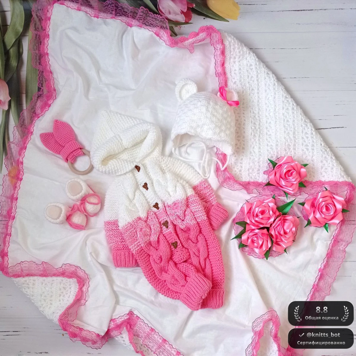 Эти очаровательные вязаные предметы включают в себя бело-розовый комбинезон с капюшоном и косами, шапочку с ушками, варежки, а также милые кусочки для соски и прелестное одеяльце с кружевной отделкой. Всё это выполнено в нежных пастельных тонах и украшено очаровательными деталями, такими как сердечки на пуговицах. Нежная текстура и цветовая гамма делают этот набор идеальным для малыша.