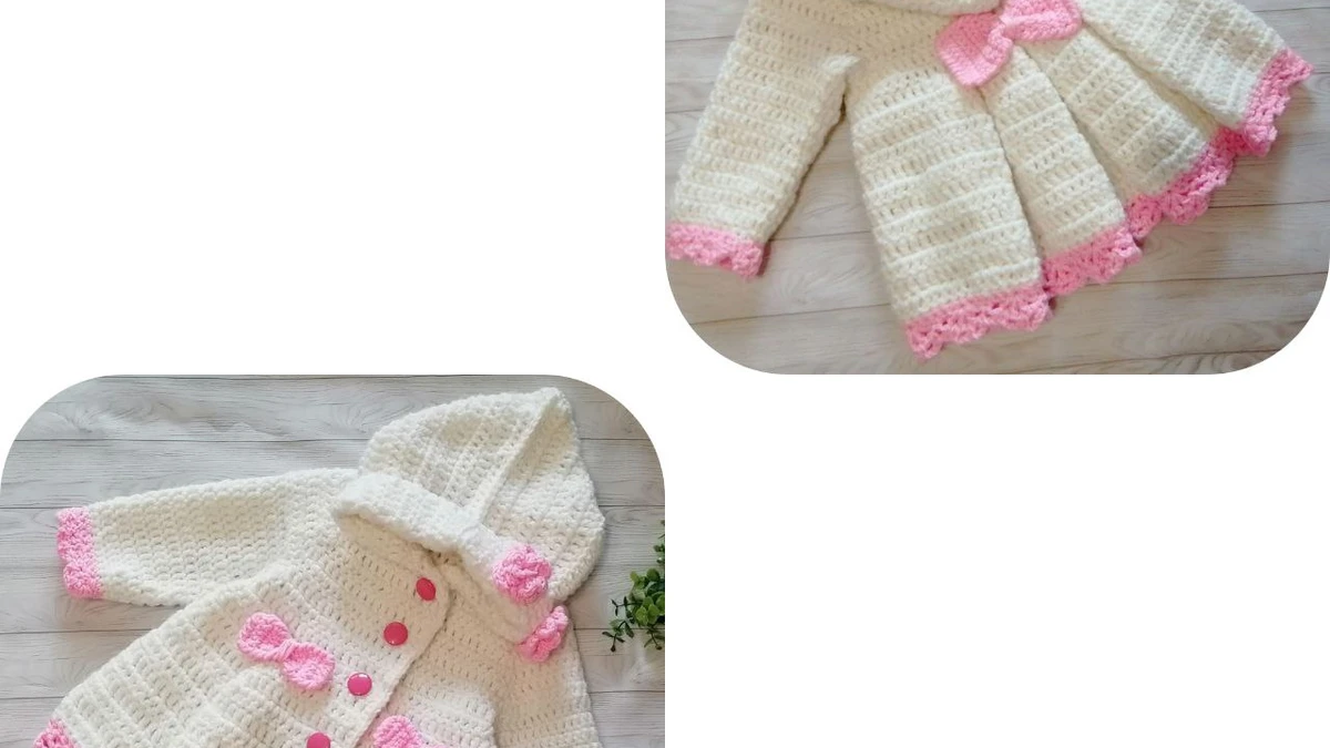Изделие выполнено крючком №5 из объёмной полушерстяной пряжи категорий Aran–Worsted, что обеспечивает сочетание лёгкости и тепла. Вязание начинается сверху вниз единой конструкцией реглан-без-шва: сначала вывязывается воротник резинкой 1×1 столбиками рельефными за переднюю и заднюю стенку, далее формируются четыре регланные линии посредством прибавок из двух столбиков с накидом, разделённых воздушной петлёй. После отделения рукавов туловище продолжается прямо, а затем в каждой второй петле выполняются удвоенные столбики с накидом — это даёт мягкое расклешение юбки. Кружевная окантовка низа и манжет связана по кругу по схеме «веер из пяти столбиков с двумя накидами, разделённых воздушной», что создаёт ажурные зубчики. Бантики вяжутся отдельно: цепочка из воздушных петель обвязывается столбиками без накида, затем затягивается центральная перемычка и пришивается потайным швом. Розочки выполнены техникой «спиральный рулет»: после полотна из чередующихся столбиков без накида и воздушных петель лента сворачивается и фиксируется стежками. Все декоративные элементы пришиты иглой штопальным швом для прочности, а пуговицы укреплены дополнительными маленькими подкладочными пуговками изнутри.