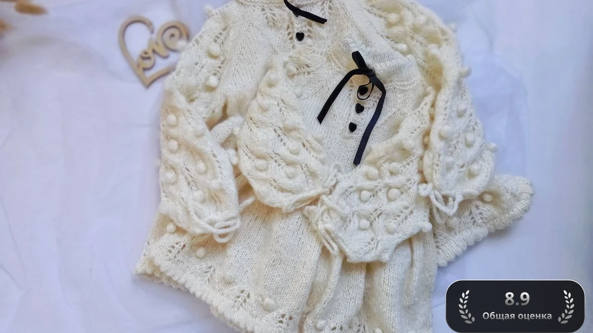 Нежнейший комплект для малышки в молочном оттенке: ажурная кофточка-болеро с регланом сверху, пышной юбочкой и рукавами, украшенными объёмными «шишечками». Лёгкие листочки в ажуре создают волнистый край, а чёрные атласные ленточки и крошечные пуговки-сердечки добавляют изысканного контраста. Полотно выглядит ровным, узор читается отлично, а мягкая пряжа придаёт изделию уют и воздушность. Работа требует внимания к деталям и демонстрирует хорошее владение техникой вязания сложных рукавов и декоративных элементов.