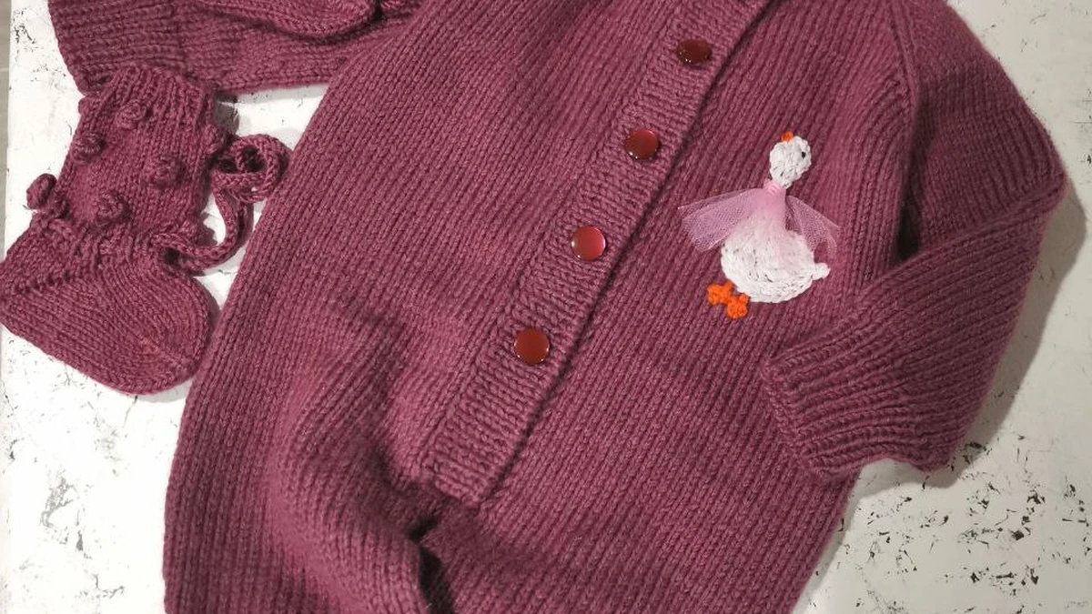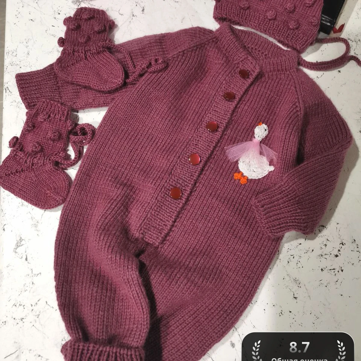 На фото — очаровательный детский вязаный комплект в оттенке «пыльная слива»: комбинезон/слип на планке с пуговицами, шапочка и пинетки (всё в одном стиле). Полотно выполнено лицевой гладью с аккуратными резинками по краям; на шапочке и пинетках — декоративные «шишечки», которые дают милую фактуру и делают набор наряднее. На комбинезоне — небольшая аппликация птички с фатиновой юбочкой: нежная деталь, добавляющая характера. В целом работа выглядит тёплой, цельной и очень подарочной.