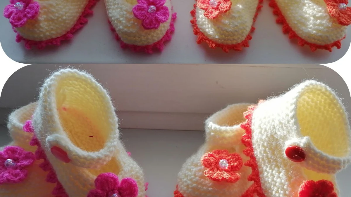 Основное полотно пинеток выполнено классической платочной вязкой на чулочных спицах №3, что обеспечивает эластичность и отсутствующую ажурность, необходимую для нежной детской кожи. Работу начинают с наборного края подошвы, провязывая центральные укороченные ряды для формирования пяточки. Далее переходят к боковым стенкам способом «подъём петель по краю» и вяжут по кругу до уровня подъёма. Закрывают петли методом «i-cord bind-off», чтобы получить мягкий, но аккуратный кант. Ремешок формируется сразу в процессе вязания: петли временно снимаются на булавку, затем провязываются узкой полосой платочной вязкой, заканчивающейся петлёй-накидом для пуговицы. Декор – цветок из пяти лепестков диаметром 3 см – связан крючком №2 из контрастной полухлопковой пряжи столбиками без накида и полустолбиками; лепестки собираются в кольцо «волшебным кольцом», центр стянут и пришивается бусина 4 мм. Кайма подошвы обвязывается «пико через три петли» контрастной нитью, создавая весёлые зубчики. Сшивание минимально: шов «трикотажная петля» по заднику, все остальные детали соединены в процессе вязания.
