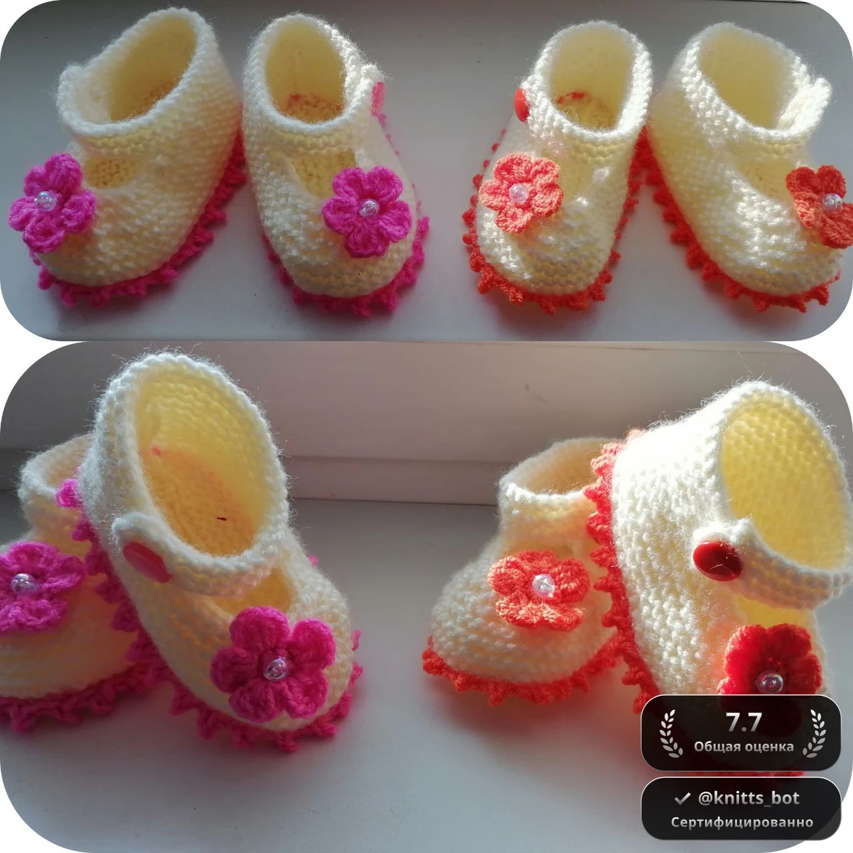 Перед нами две очаровательные пары детских пинеток-туфелек цвета топлёного молока. Каждая пара украшена контрастной ажурной каймой «пико» по подошве и верхнему краю – одна в ярко-малиновом, другая в кораллово-оранжевом оттенке. Боковую часть венчает объёмный пятилистный цветок, связанный крючком и украшенный переливчатой бусиной; на ремешке-перемычке – аккуратная пуговка-сердечко в тон каймы. Основное полотно связано платочной вязкой, благодаря которой пинетки мягкие, эластичные и отлично держат форму, а изнанка столь же аккуратна, как и лицо. Яркий декор придаёт классической форме весеннюю нежность и игру красок.