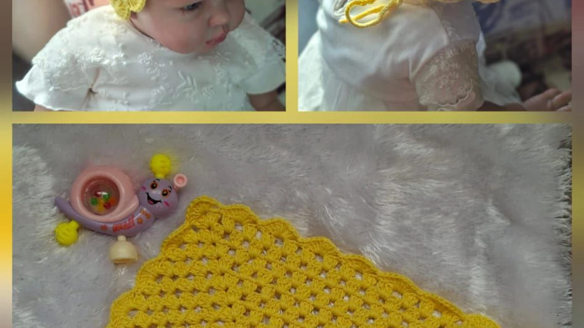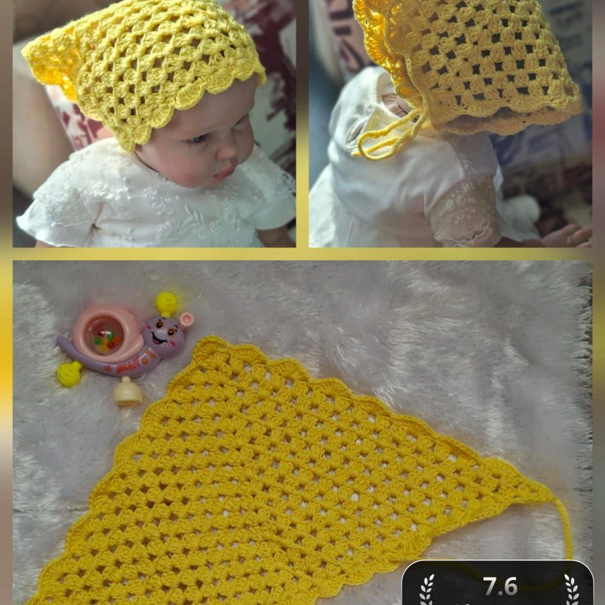 Очаровательный летний чепчик-косынка, связанный ярко-жёлтой хлопковой пряжей по мотиву классического «бабушкиного» квадрата, превращённого в треугольник. Ажурные ячейки образуют воздушную текстуру, благодаря чему головка малыша хорошо вентилируется даже в жару. Нежная ракушечная кайма добавляет девчачьего шарма, а тонкие шнурки-завязки надёжно фиксируют изделие. На ребёнке модель выглядит особенно мило: плотная посадка по линии лба и затылка, лёгкий «капорный» объём сзади и солнечный цвет создают образ маленькой сказочной пчёлки.